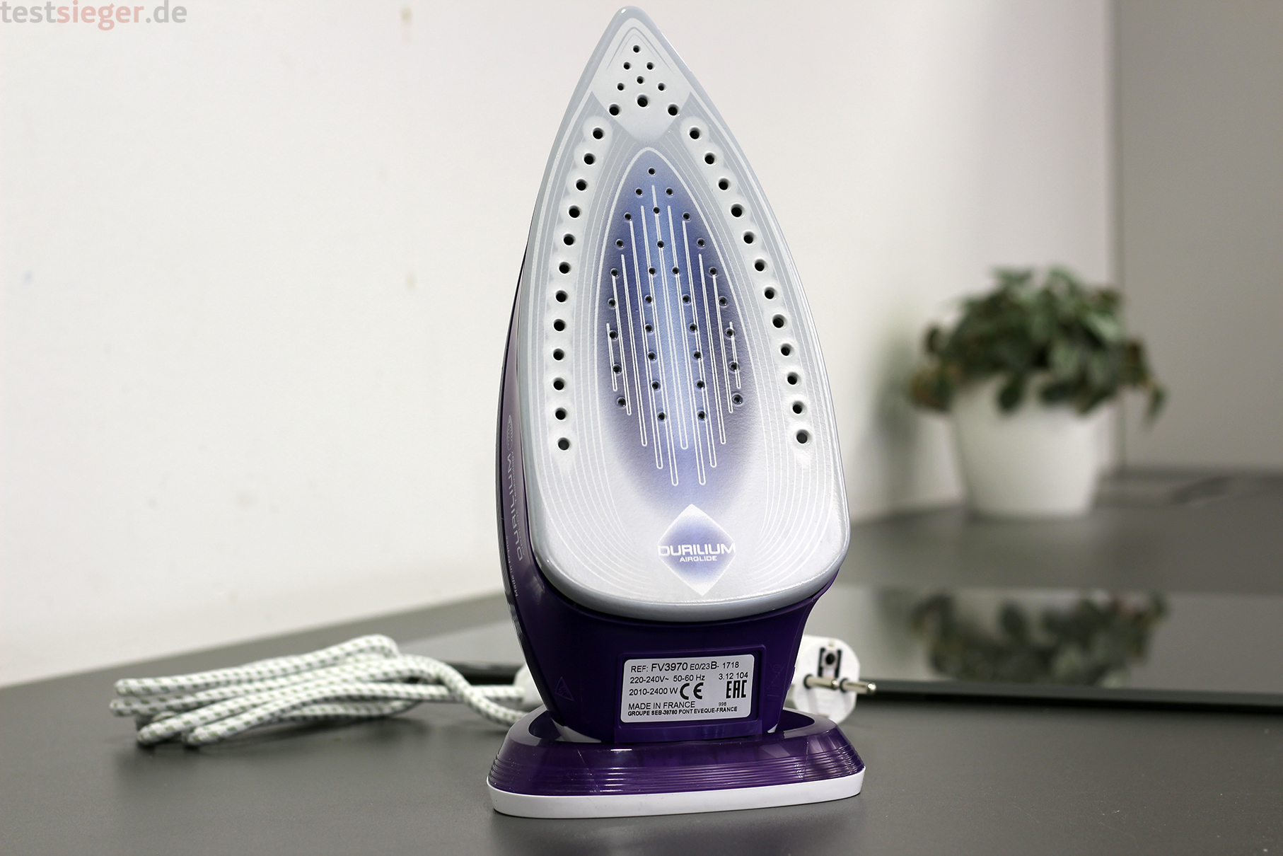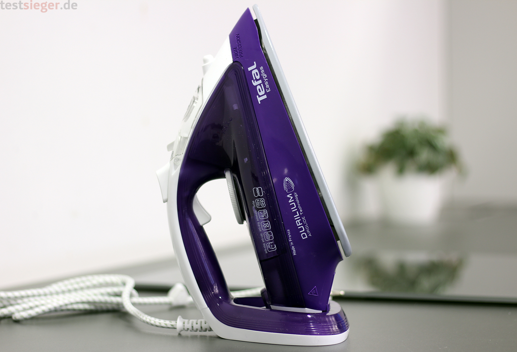Die Sohle besteht aus der Tefal-Eigenentwicklung Durilium, die durch eine ausgezeichnete Widerstandsfähigkeit glänzt. Bei unserem Kratztest mussten wir viel Kraft aufwenden, um schwerwiegende Beschädigungen zu verursachen. Damit ist es auch kein Problem, wenn die Sohle einmal Bekanntschaft mit einem Reißverschluss oder Knöpfen macht. Mit einer Breite von 13,5 Zentimetern, einer Höhe von knapp 14 Zentimetern und einer Länge von circa 29,5 Zentimetern ist das Tefal Easygliss weder zu klein, noch zu groß ausgefallen.