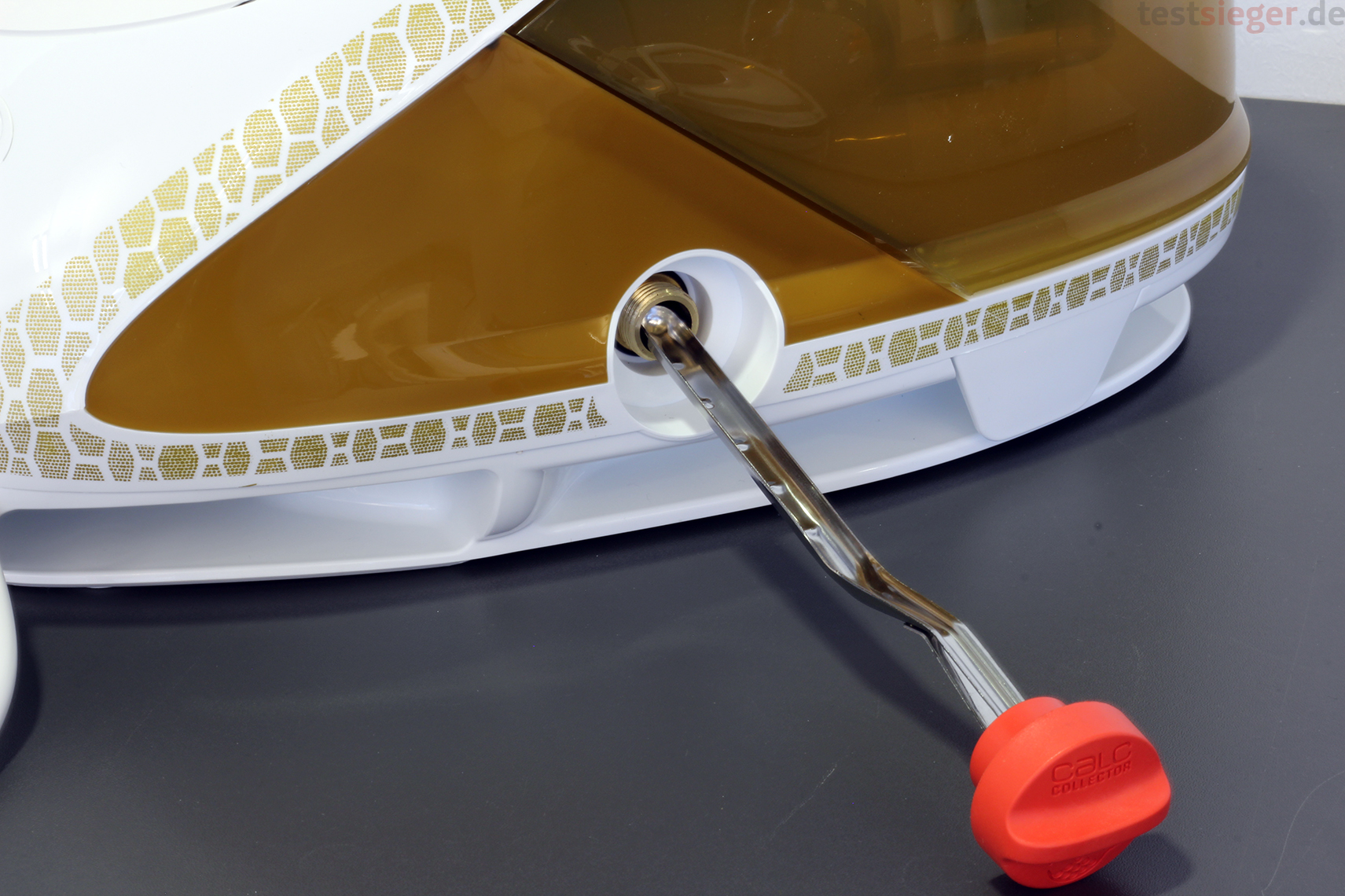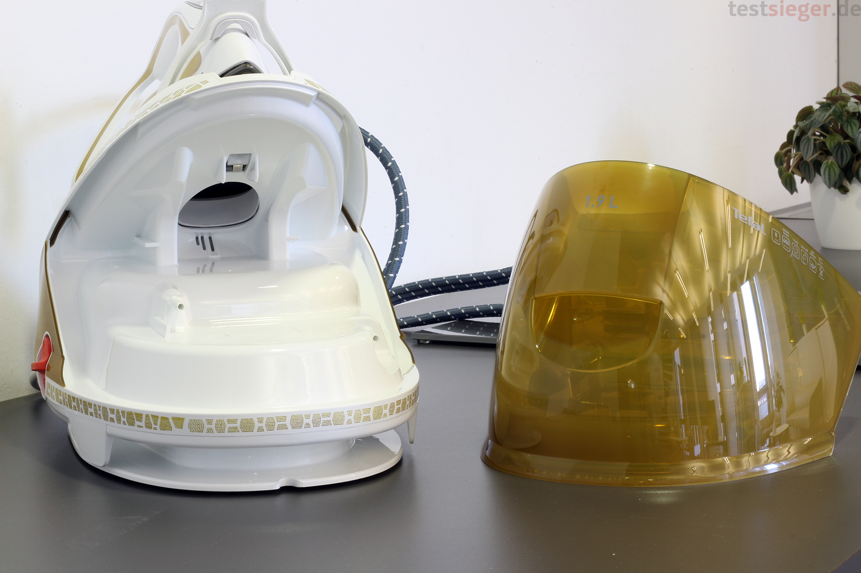 Optisch sticht das Tefal GV9581 vor allem durch die in Gold gehaltene Farbgebung hervor. Das ist sicherlich Geschmackssache, ein Blickfang ist die Dampfstation aber allemal. Zudem spring der Griff des Bügeleisens in Auge. Dieser teilt sich an der Hinterseite in zwei Teile, die bogenförmig nach unten laufen und so den Standfuß formen.Die Verarbeitungsqualität überzeugt nicht auf ganzer Linie. Der verwendete Kunststoff ist zwar robust und lässt sich selbst unter großem Kraftaufwand nicht verbiegen, die Ausnahme stellt der Wassertank dar. Hier sind die Seitenwände recht dünn und lassen sich problemlos verbiegen. Außerdem muss die Dampfstation mit ein paar Unsauberkeiten leben. So finden sich kleiner Produktionsrückstande und teilweise recht große Spaltmaße, in denen sich Schmutz ablagern kann. Ein paar scharfe Kanten und spitze Stellen – vor allem am Wassertank – hinterlassen ebenfalls keinen guten Eindruck.