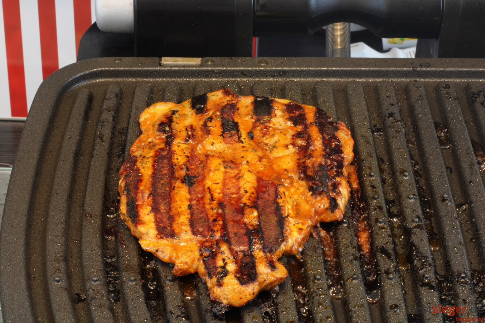 Sind alle Einstellungen getroffen, kann das Grillen durch Betätigen der OK-Taste beginnen. Danach startet der OptiGrill die Aufheizphase. Aus dem Kaltstart benötigt der Tefal knapp 6 Minuten, bis der Nutzer das Grillgut auflegen kann. Wir starten den Test mit einem Zentimeter dicken Schweinesteak. Auf den knapp 30 Zentimeter breiten und 20 Zentimeter tiefen Grillplatten finden drei Steaks Platz. Die Zubereitung geht wirklich rasant. Bereits nach 30 Sekunden ist der Rare-Zustand erreicht, nach gerade einmal 45 weiteren Sekunden ist das Fleisch auch schon Medium gebraten. Am Übergang zur Durchgebraten-Stufen ist das Fleisch wirklich nur noch einen Hauch Rosa, aber immer noch wunderbar saftig. Wer es lieber noch etwas mehr Medium möchte, sollte das Gargut 5 – 10 Sekunden früher herausnehmen. Als nächstes legen wir drei Zentimeter dicke Rindersteaks auf. Hier verlängert sich die Garzeit und die Ergebnisse sind genauso hervorragend.
