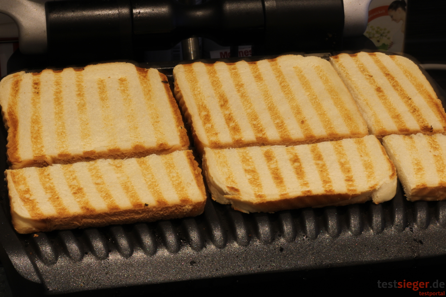Als nächstes Überprüfen wir die Hitzeverteilung mit unserem Toastbrottest. Wir legen die komplette Fläche aus und überprüfen den Bräunungsgrad nach 45 Sekunden im Panini-Modus. Es fällt direkt die sehr schöne Maserung auf. Diese lässt sich über das separate Grillsteifen-Programm sogar noch einmal intensivieren. Die Funktion lässt sich praktischerweise jederzeit über eine eigene Taste zuschalten – genau wie die Auftaufunktion. Nach zwei Minuten sind die Brotscheiben sehr kross, aber noch nicht verbrannt. Die Bräunung ist schön gleichmäßig, auch an den Rändern. Der OptiGrill punktet also durch eine sehr gute Wärmeverteilung. Auch Fisch, Bacon und Gemüse meistert das Gerät.