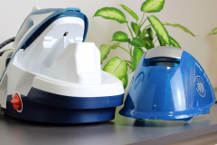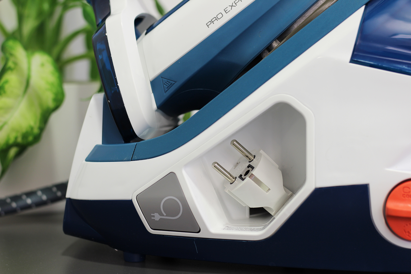 Das Stromkabel ist mit 1,8 Metern schön lang ausgefallen und verschwindet über einen automatischen Aufrollmechanismus komplett in der Dampfstation. Die entsprechende Taste ist direkt neben der Kabelöffnung platziert und hat einen angenehmen Druckpunkt. Der Mechanismus arbeitet zuverlässig, nur hin und wieder kann es passieren, dass der Nutzer am Ende etwas nachhelfen muss. Das Bügeleisen ist mit einem 1,7-Meter-Schlauch fest mit der Dampfstation verbunden. Dieser lässt sich ebenfalls – wenn auch nur händisch – zu einem Großteil im Gehäuse verstecken. Die großzügige Länge gibt eine ausgezeichnete Flexibilität. Die Dampfstation muss nicht einmal unbedingt auf dem Bügelbrett stehen.