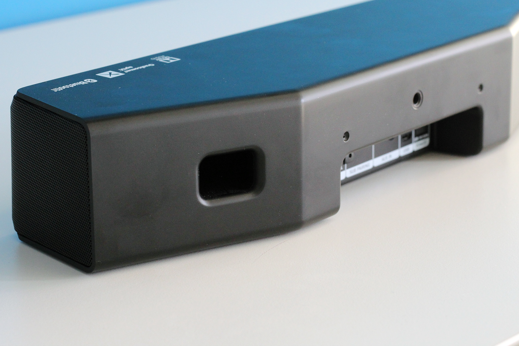 Optisch macht sie ebenfalls einen guten Eindruck. Durch die mattschwarze Kunststoffoberfläche wirkt sie zurückhaltend. Die Front und die Seiten werden von einem feinmaschigen Gitter abgedeckt, hinter dem sich die vier Lautsprecher befinden. Rote Ringe und die Töner setzen einen optischen Akzent. Gummierte Flächen an der Unterseite garantieren einen sicheren Stand. In puncto Verarbeitungsqualität lässt sich die Cinebar One fast nichts zuschulden kommen. Die verwendeten Materialien machen einen hochwertigen Eindruck. Einzig die Spaltmaße zwischen Gitter und Kunststoffabdeckung sind etwas zu groß ausgefallen. Hier können wir sogar mit dem Fingernagel dazwischenfahren und die Abdeckung etwas anheben. Das schmälert den positiven Gesamteindruck jedoch nur geringfügig.