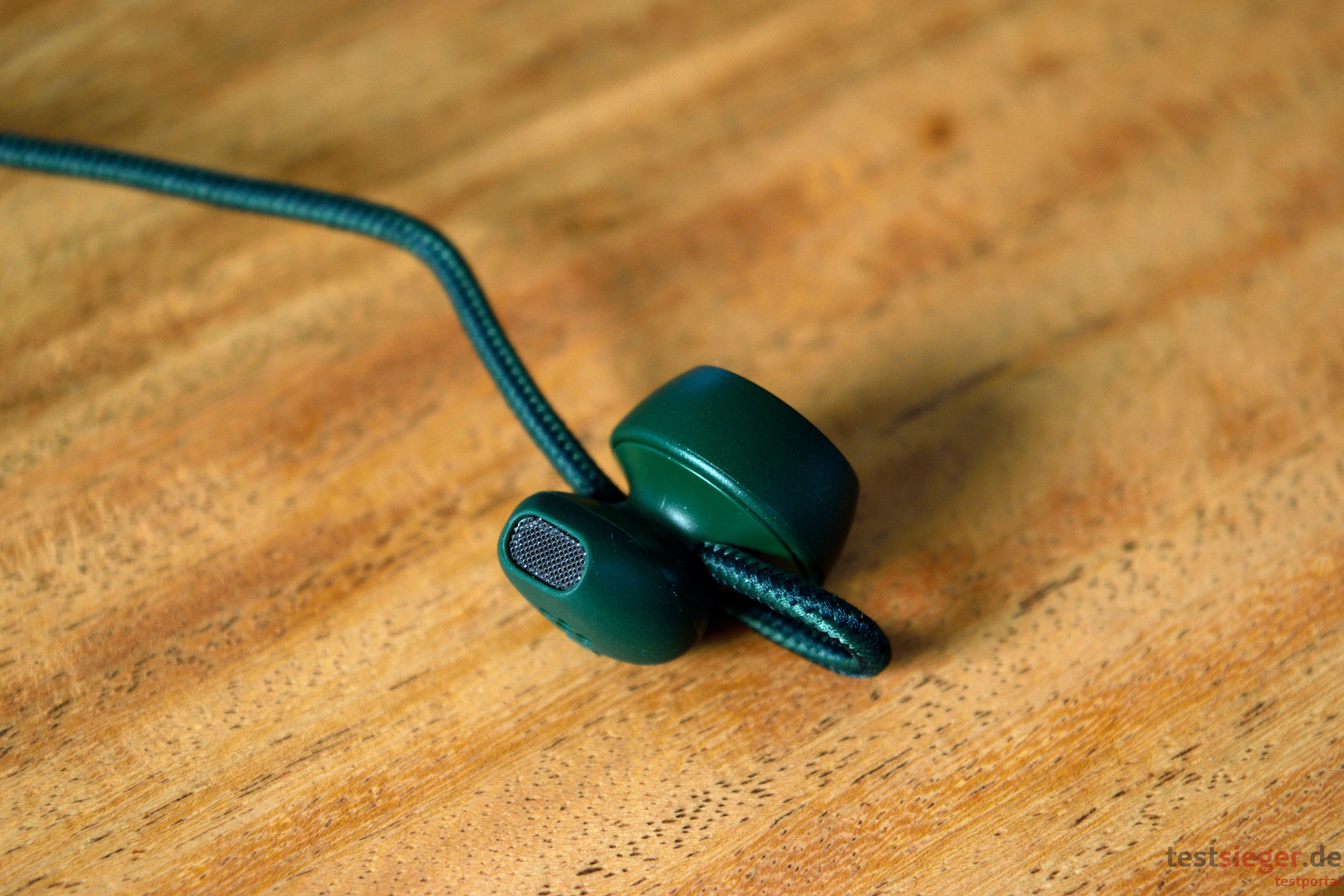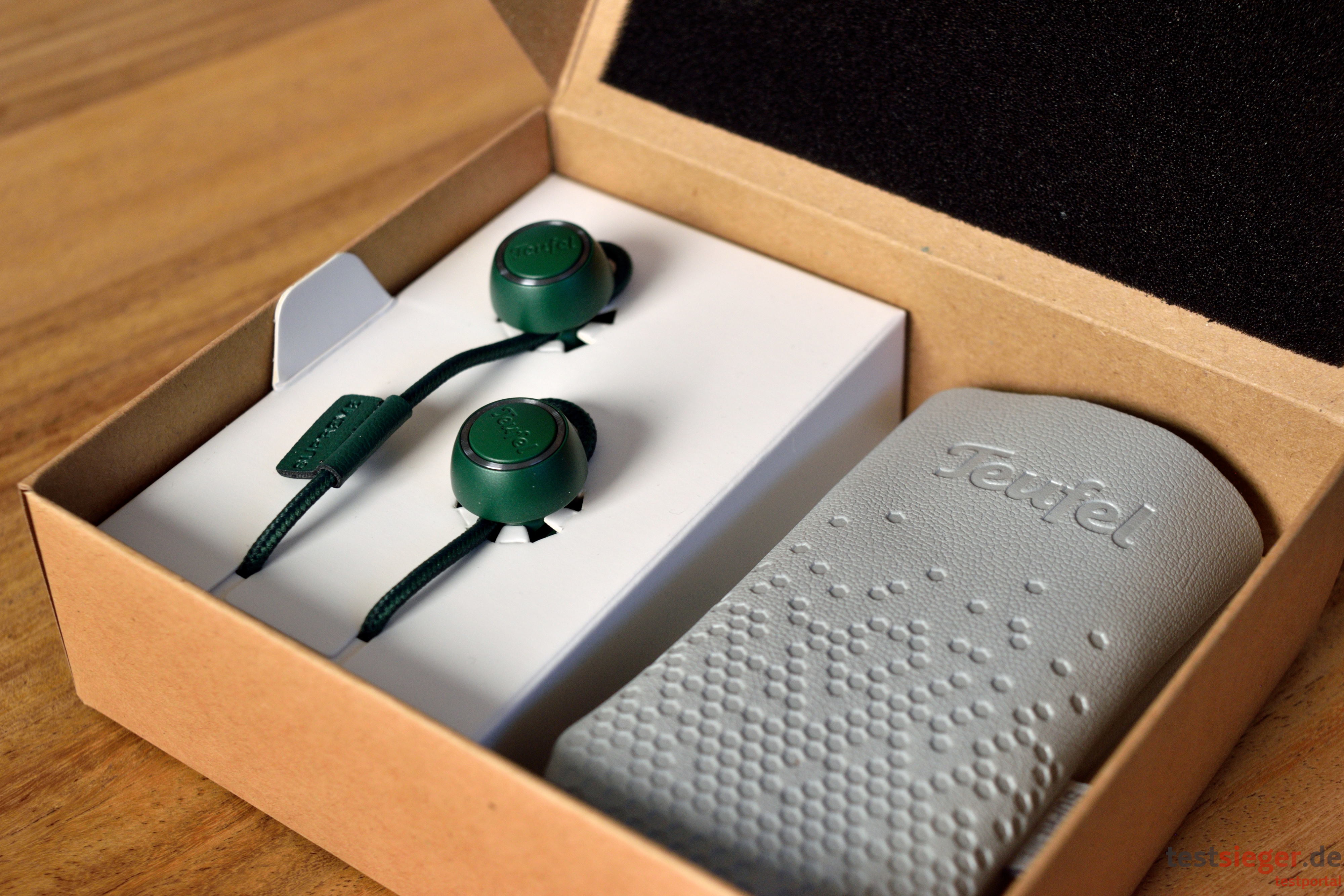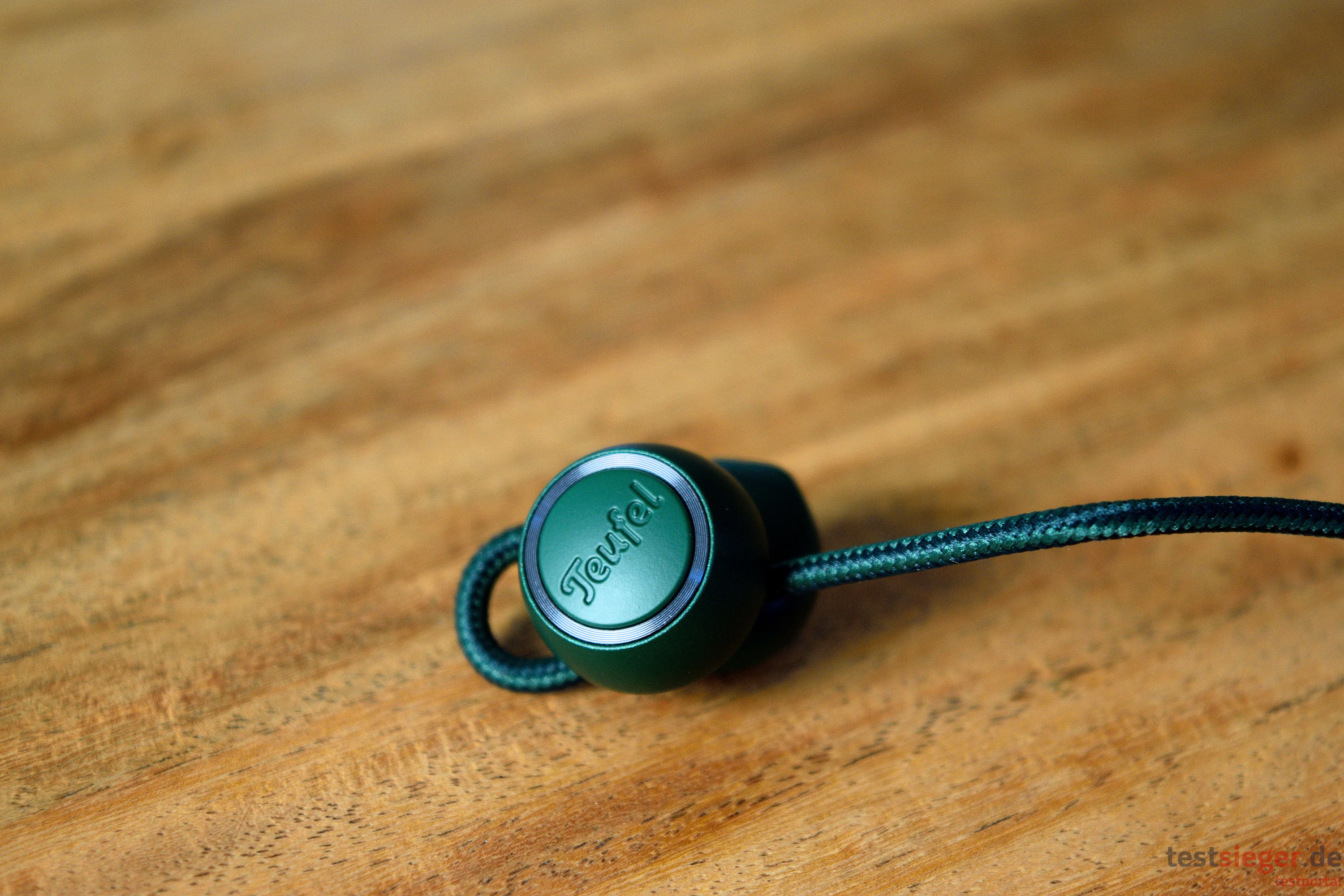 Die Buds an sich sind optisch eher unauffällig, aber wertig verarbeitet. Auf der Rückseite prangt das Teufel-Logo, ein metallischer Ring setzt einen optischen Akzent. Zur Wahl stehen gleich sechs eher gedeckte Farben: Night Black, Ivy Green, Space Blue, Moon Gray, Sand White und Pale Gold. Hübsch: Auch die dreitastige Kabelfernbedienung und die Stoffummantelung des Kabels sind bunt.