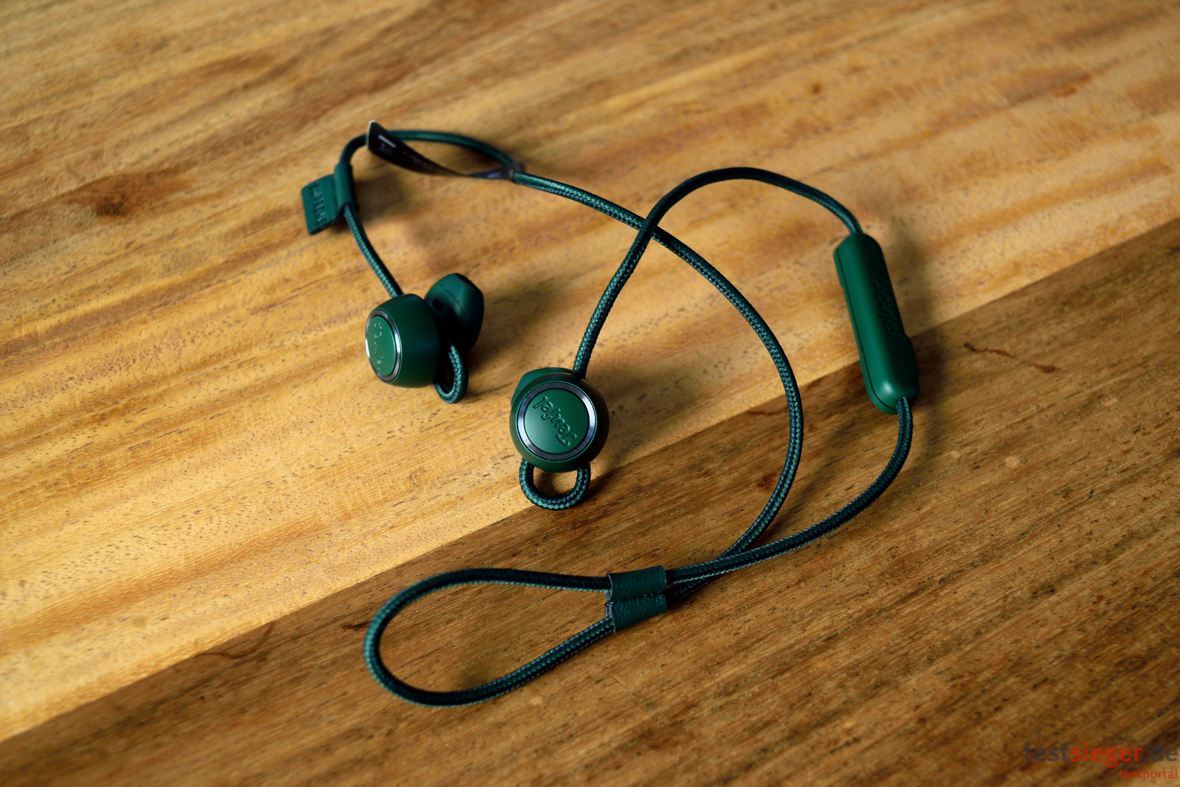 Thema Fernbedienung: Die Steuerung klappt intuitiv. In der Bedienungsanleitung gibt es eine knappe Übersicht über alle Funktionen. Die drei Tasten (lauter, leiser, Multifunktion) haben einen angenehmen Druckpunkt, der versehentliches Bedienen verhindert – in unserem Test klappt die Bedienung reibungslos. Die Kopplung per Bluetooth funktioniert auf Anhieb, auch das Wiederverbinden mit einem Gerät. Ausschalten funktioniert durch Verbinden der Buds an den magnetischen Rückseiten.