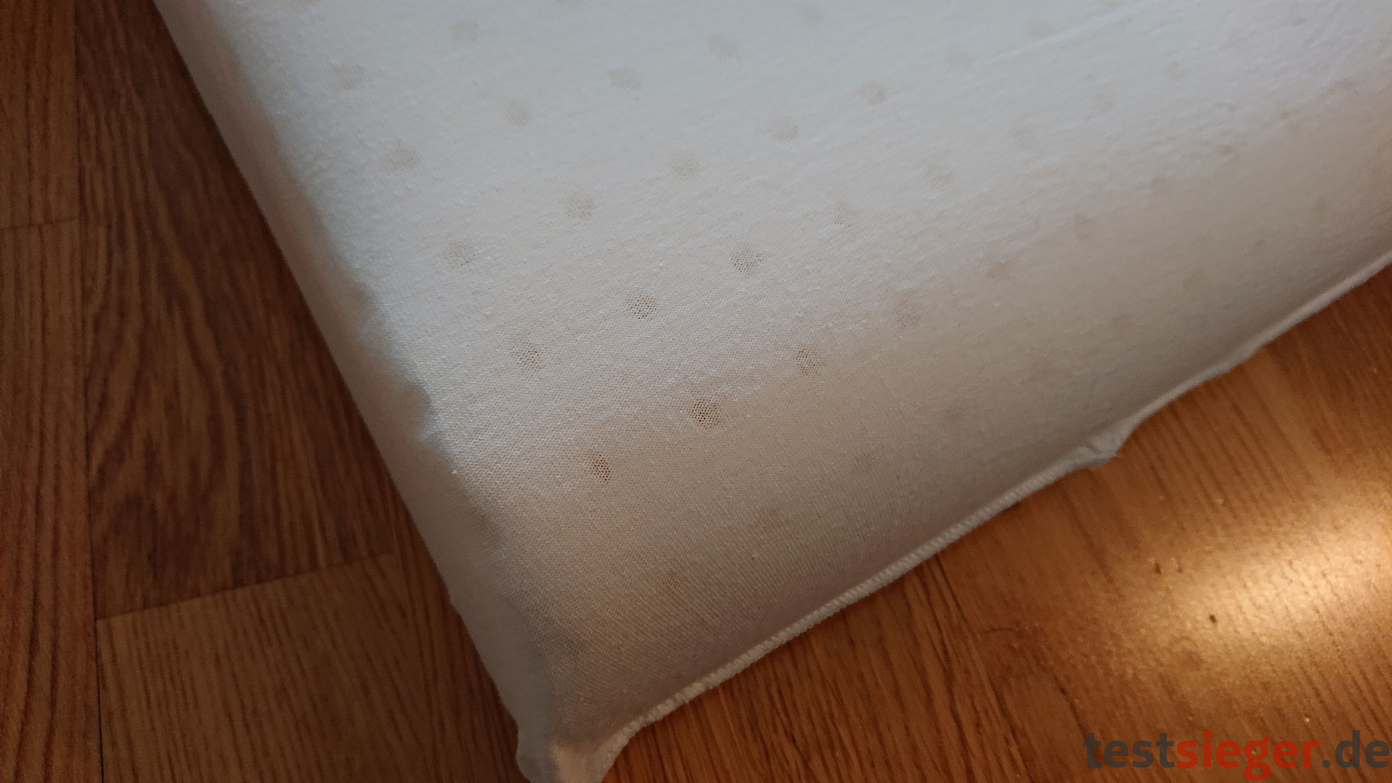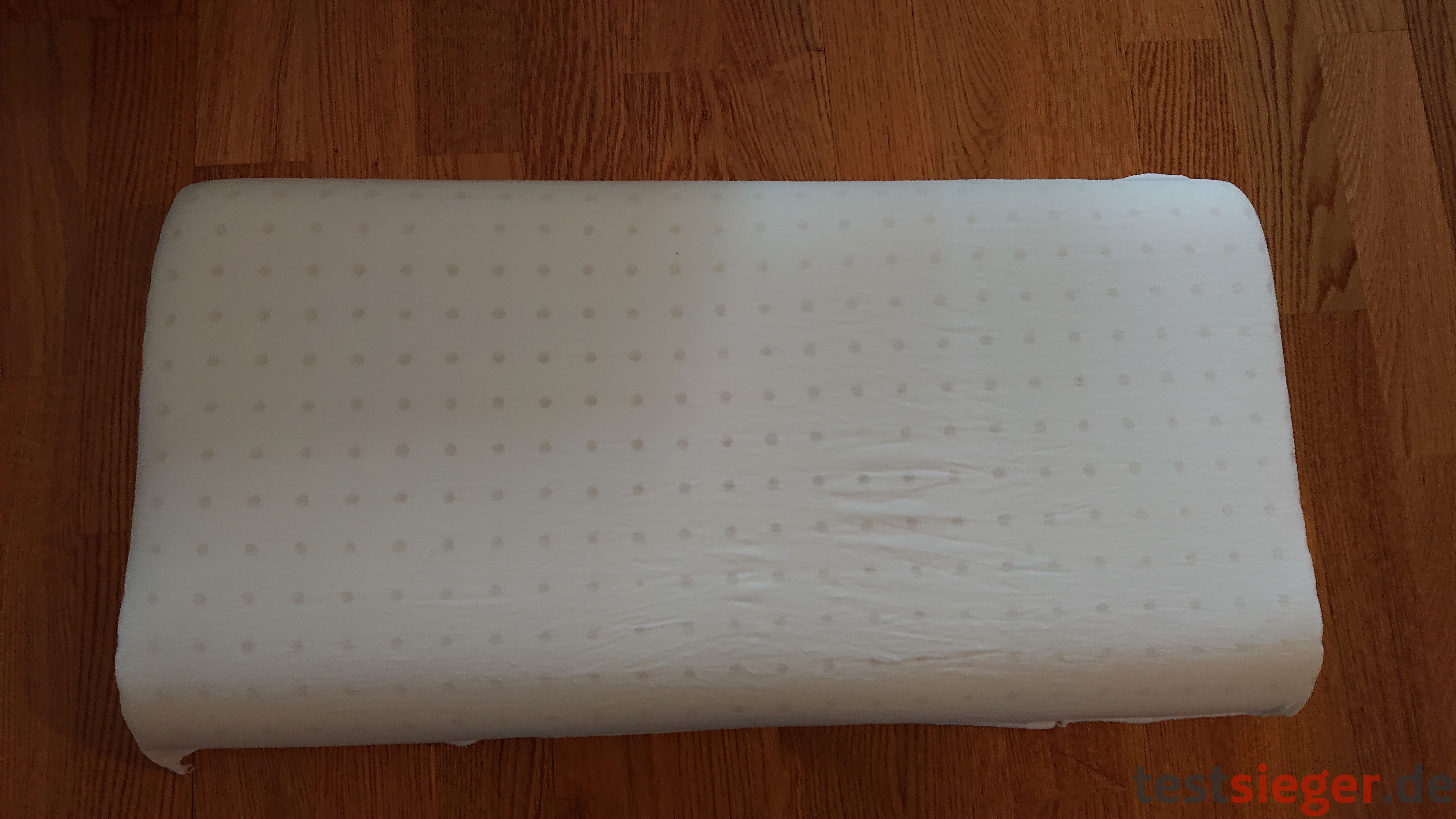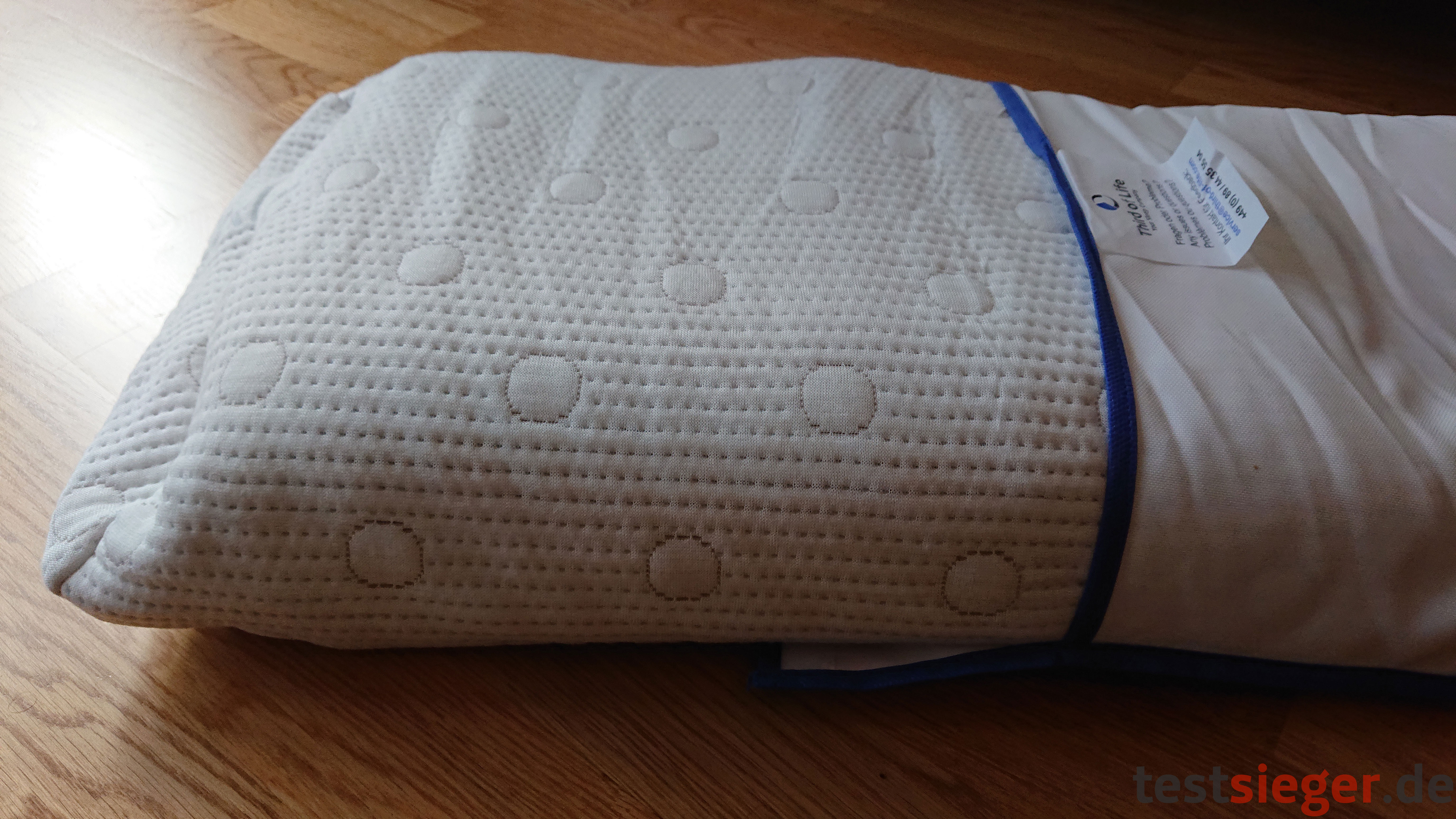 In der Handhabung ist das Kissen sehr unkompliziert. Im Lieferumfang befindet sich neben dem Bezug, dem Memory-Foam-Kissen und der dazugehörigen Einlage noch eine Aufrolltasche, die äußerst praktisch für eine bevorstehende Reise ist. Hier wird das Kissen bei Bedarf eingerollt, in der Tasche verstaut und kann so einfacher transportiert werden. Im Test brauchen wir allerdings drei Anläufe, um das Kissen kompakt genug einzurollen, damit der Klettverschluss fest verschlossen ist und nicht wieder aufspringt. Hier wäre ein Reißverschluss von Vorteil, denn der Klettverschluss ist mit Sicherheit nach einiger Zeit durch Flusen oder Staub verschmutzt, sodass er nicht mehr optimal hält. Nach dem Öffnen der Verpackung und der Aufrolltasche sollte das Kissen einige Zeit zum Auslüften an der frischen Luft liegen. Außerdem muss sich das Kissen durch das Aufrollen erst wieder in seine ursprüngliche Form entfalten, was aber nicht lange dauert. Das Memory-Foam-Kissen und die Einlage sind nicht waschbar. Den Bezug können Nutzerinnen und Nutzer aber bei 40 Grad in der Waschmaschine problemlos reinigen.