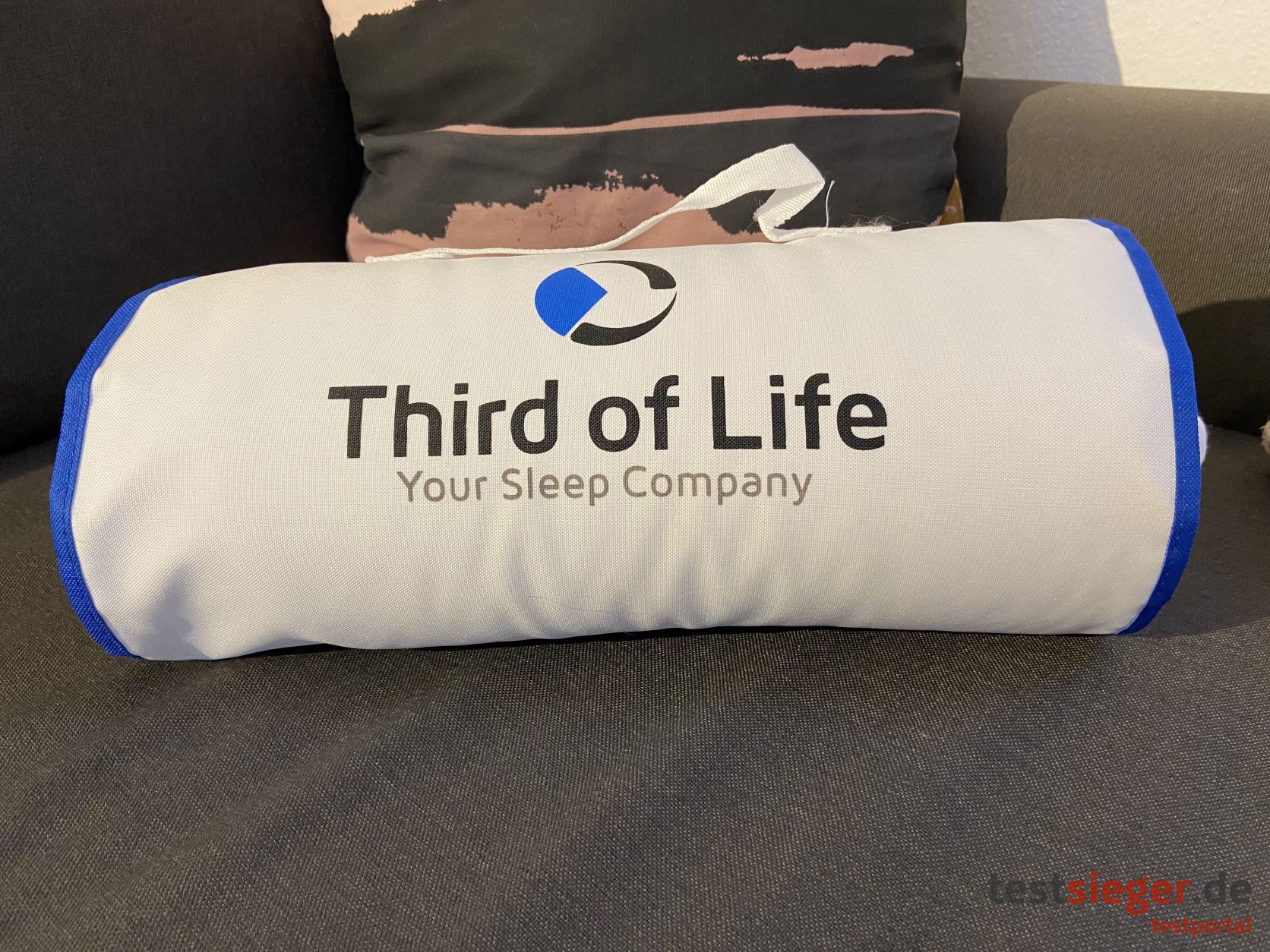 Das Nackenstützkissen NuMoon von Third of Life kommt fest eingerollt in einem Tragetuch daher. Darum befindet sich eine Papierbanderole mit den wichtigsten Produkteigenschaften. Wir entfernen die Banderole und halten die Tragetasche mitsamt Kissen in Händen. Auf der Vorderseite der Tasche sehen wir das Logo und den Herstellernamen. Wir öffnen das Einschlagtuch, das ein Klettverschluss zusammenhält. Sofort entfaltet sich das darin eingerollte Kissen. Dabei stellen wir keinen unangenehmen Geruch fest. Trotzdem folgen wir dem Rat des Herstellers und lassen das Kissen noch ein paar Stunden offen daliegen, damit sich etwaige Gerüche verflüchtigen können.