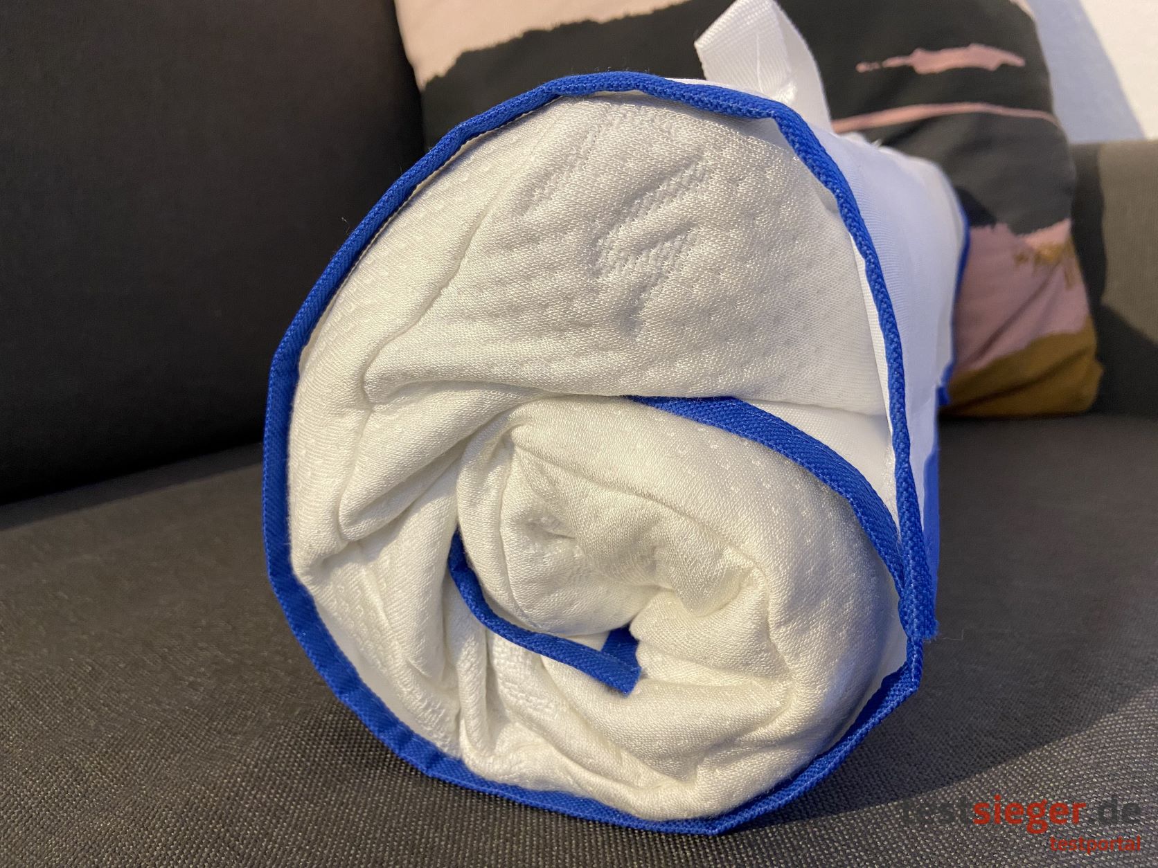 Bereits nach wenigen Minuten hat sich das Kissen vollends ausgerollt und liegt in seiner ursprünglichen Form vor uns. In der Länge misst es 56 Zentimeter, in der Tiefe 38 Zentimeter, die Höhe beträgt 12 Zentimeter. Damit ist das Kissen recht breit bemessen und bietet genug Spielraum beim Schlafen. An der unteren Längsseite sehen wir eine leichte Einbuchtung. Das Kissen ist bereits mit einem weißen Überzug bezogen. Auf ihrer Homepage bieten Third of Life weitere Bezüge in den Farben Schwarz, Dunkelblau und Hellgrau an. Das weiße Kissen harmoniert mit unseren Bettbezügen. Nutzerinnen und Nutzern muss jedoch klar sein, dass auf dem weißen Bezug schnell Flecken sichtbar sein können. Praktisch hierbei ist, dass im Lieferumfang ein zweiter Kissenbezug enthalten ist.