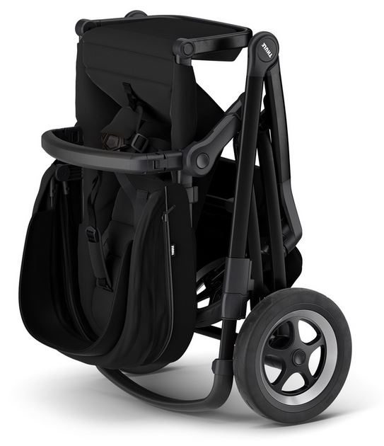 Der Thule Sleek steht uns zum Test in der Farbe Black on Black zur Verfügung. Nach dem Auspacken erscheint er gleich auf den ersten Blick recht hochwertig. Wie schon die Herstellerfarbe verrät, ist der Kombikinderwagen im schlichten Schwarz gehalten. Allerdings erscheint der Thule aus seitlicher Betrachtung recht kantig, was auf uns nicht sonderlich dynamisch wirkt. Das ist aber natürlich Geschmackssache.Die verwendeten Textilien haben eine gute Haptik und hinterlassen einen qualitativ wertigen Gesamteindruck. Nähte, Knöpfe und Reißverschlüsse sind sorgfältig verarbeitet. Das Gestell des Kinderwagens besteht aus Aluminium und ist daher schön leicht und robust, was sich beim Herausheben aus dem Karton gleich bemerkbar macht. Auch bei den Schweißnähten arbeitet Thule sehr sauber. Die Ummantelungen von Schieber und Sicherheitsbügel bestehen aus hochwertigem Kunstleder. Die verwendeten Kunststoffelemente sind alle fest am Gestell angebracht.