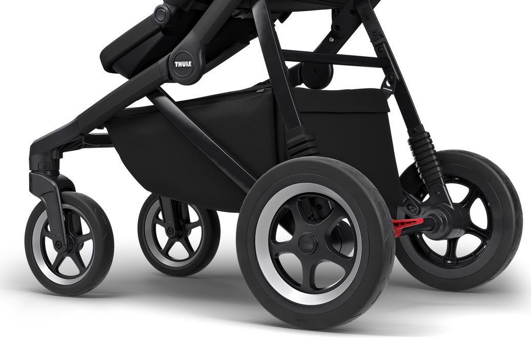 Alle vier Räder laufen flüssig. Die Allrad-Federung macht sich bei der kleinsten Unebenheit bemerkbar. So rollt der Kombikinderwagen allzeit ruhig über Stock und Stein. Bei unwegsamen Gelände können die Vorderräder per Knopfdruck festgestellt werden. Schön wäre es, diesen Vorgang nicht nur mit den Händen, sondern auch mit dem Fuß vornehmen zu können. Ein tolles Feature: Die Räder können stehen wie sie wollen, beim Feststellen rollen sie automatisch in eine gerade Position und rasten dann erst ein. Auch wenn es mal über Wiese oder Schotter geht, haben wir während des Praxistests nicht das Gefühl, dass der Sleek sich nicht mehr gut lenken oder schieben lässt. Und auch voll beladen bleibt der Kinderwagen wendig und lässt sich einwandfrei manövrieren. Die Fußfeststellbremse, die im auffälligen Rot nicht zu übersehen ist, lässt sich einfach betätigen. So rollt der Thule bei eingestellter Bremse keinen Meter weg.