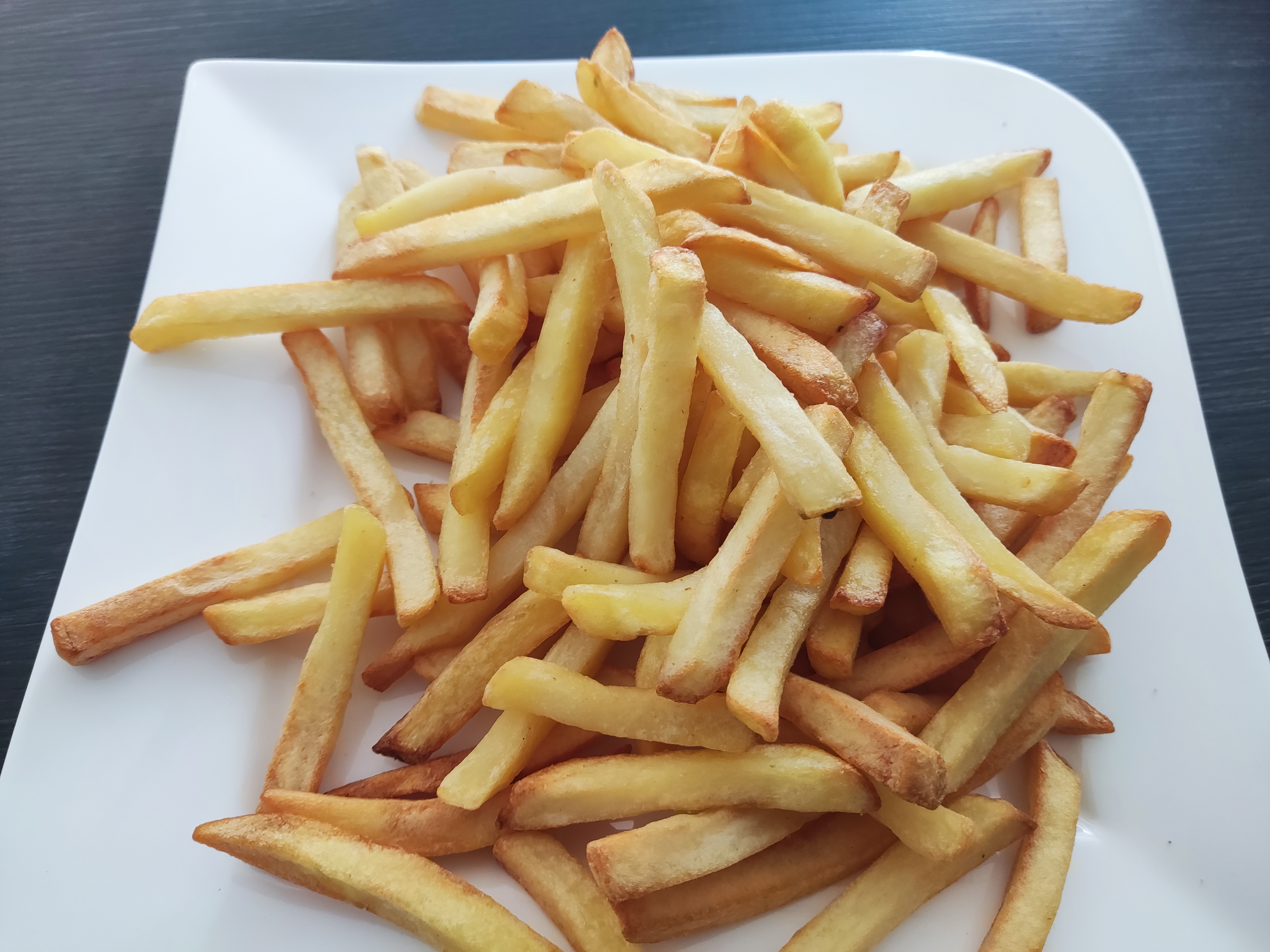 Der Tristar FR-6964 liefert insgesamt überzeugende Ergebnisse. Wir bereiten zuerst 750 Gramm Feinschnittpommes zu. Die Voreinstellung gibt 15 Minuten bei 200 Grad Celsius an. Die Temperatur ist sinnvoll, die Zeit jedoch etwas zu kurz. Bis zu einem zufriedenstellenden Resultat vergehen im Test 25 Minuten. Dabei schütteln wir die Stäbchen nach der Hälfte der Zeit gut durch. Die Hitzeverteilung im Inneren ist absolut in Ordnung. Zwar sind die Pommes nicht ganz gleichmäßig gebräunt, sie sind jedoch alle durch und nur noch die Wenigsten bekommen gar keine Farbe ab. Für die frischen Pommes verwenden wir die Gitterbleche. Im Gegensatz zur Tiefkühlkost bestreichen wir die Kartoffeln hier mit etwas Öl. Auch hier gefallen uns die Resultate. Durch das Gitter gelangt die heiße Luft an alle Seiten und gar recht gleichmäßig. Das überschüssige Öl tropft auf die Auffangschale auf dem Boden.