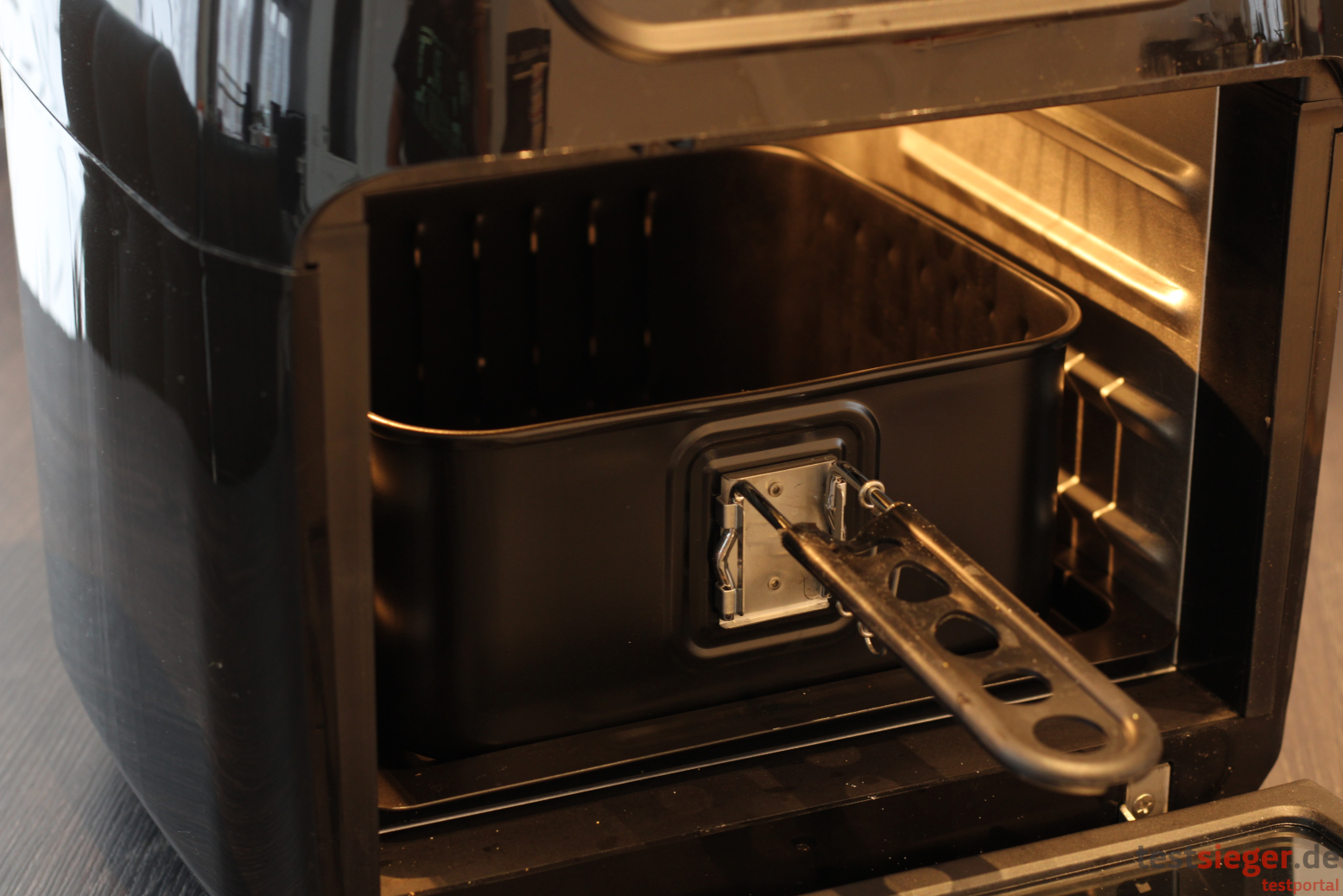 Der Garraum nimmt etwas über die Hälfte des Gehäuses in Anspruch und hat ein Gesamtvolumen von 10 Litern. Das klingt zunächst viel, allerdings lässt sich nie der gesamte Platz nutzen. Zur Verwendung als Heißluftfritteuse legt Tristar einen Korbeinsatz mit Luftschlitzen bei. Dieser fasst maximal 750 Gramm Pommes Frites. Das sollte für einen Zwei-Personen-Haushalt genügen, Familien mit Kindern müssen sich jedoch nach etwas Größerem umsehen. Zum Einsetzen und Entfernen des Korbs befindet sich ein Klemmgriff im Lieferumfang, den Nutzerinnen und Nutzer an die entsprechende Halterung anbringen. Die Klemmkraft ist allerdings nicht die beste, zum Anheben reicht es zwar problemlos, um das Gargut durch Schütteln zu Wenden jedoch nicht. In unserem Praxistest löst sich der Griff regelmäßig vom heißen Korb. In diesem Fall sind Ofenhandschuhe also die bessere Wahl. Wer den FR-6964 als Backofen verwenden möchte, nutzt die beiliegenden Gitterbleche. Mit Abmessungen von 24 auf 22 Zentimetern fallen diese aber ebenfalls recht klein aus. Zum Aufbacken von mehreren Brötchen genügt es aber beispielsweise.