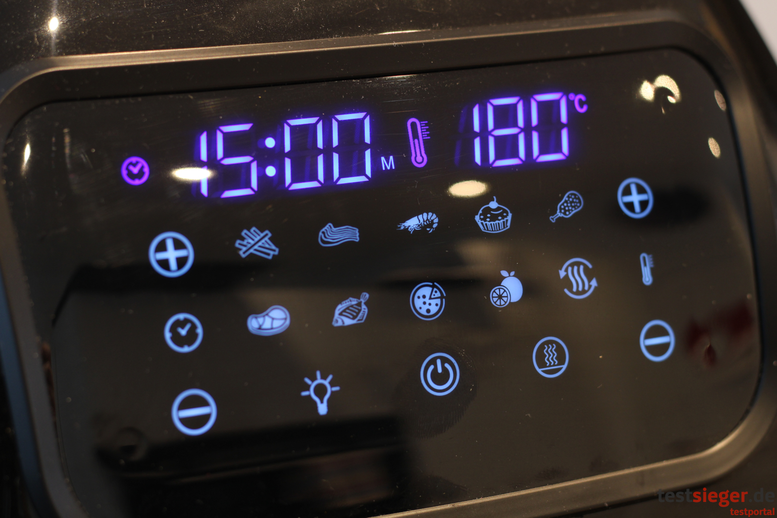 Die Bedienzeile befindet sich Oberhalb der Tür und ist komplett berührungsempfindlich. Durch Druck auf die Power-Taste erwacht der Backofen aus dem Standby-Modus. Wer ihn komplett vom Strom nehmen will muss das angenehm lange Kabel aus der Steckdose ziehen. Ein alphanumerisches Display zeigt die gewählte Zeit und Temperatur an. Die Einstellungen lassen sich über die entsprechenden Tasten natürlich individuell anpassen. Zudem verfügt der Tristar über insgesamt 10 Voreinstellungen, denen der Hersteller jeweils eine eigene Taste spendiert. Zur Auswahl stehen Pommes Frittes, Koteletts, Shrimps, Backen, Keulen, Steak, Fisch, Pizza, Dörren, Auftauen und Vorheizen. Bei den Einstellungen handelt es sich nur um Richtwerte, in der Praxis unterscheiden sie sich deutlich und hängen vor allem mit der Menge und der Dicke des Gargutes zusammen. Trotzdem geben sie einen guten Richtwert, mit dem Nutzerinnen und Nutzer sich langsam an die perfekten Ergebnisse herantasten können. Insgesamt funktioniert die Bedienung einfach und intuitiv, im Zweifel hilft die Anleitung weiter. Die Touch-Tasten setzen die Eingaben zuverlässig und schnell um. Allerdings erzeugen sie bei jedem Druck einen lauten Piepton, der sich nicht deaktivieren lässt. Das geht schnell auf die Nerven, hier hätten wir uns ein leichtes Vibrations-Feedback gewünscht.