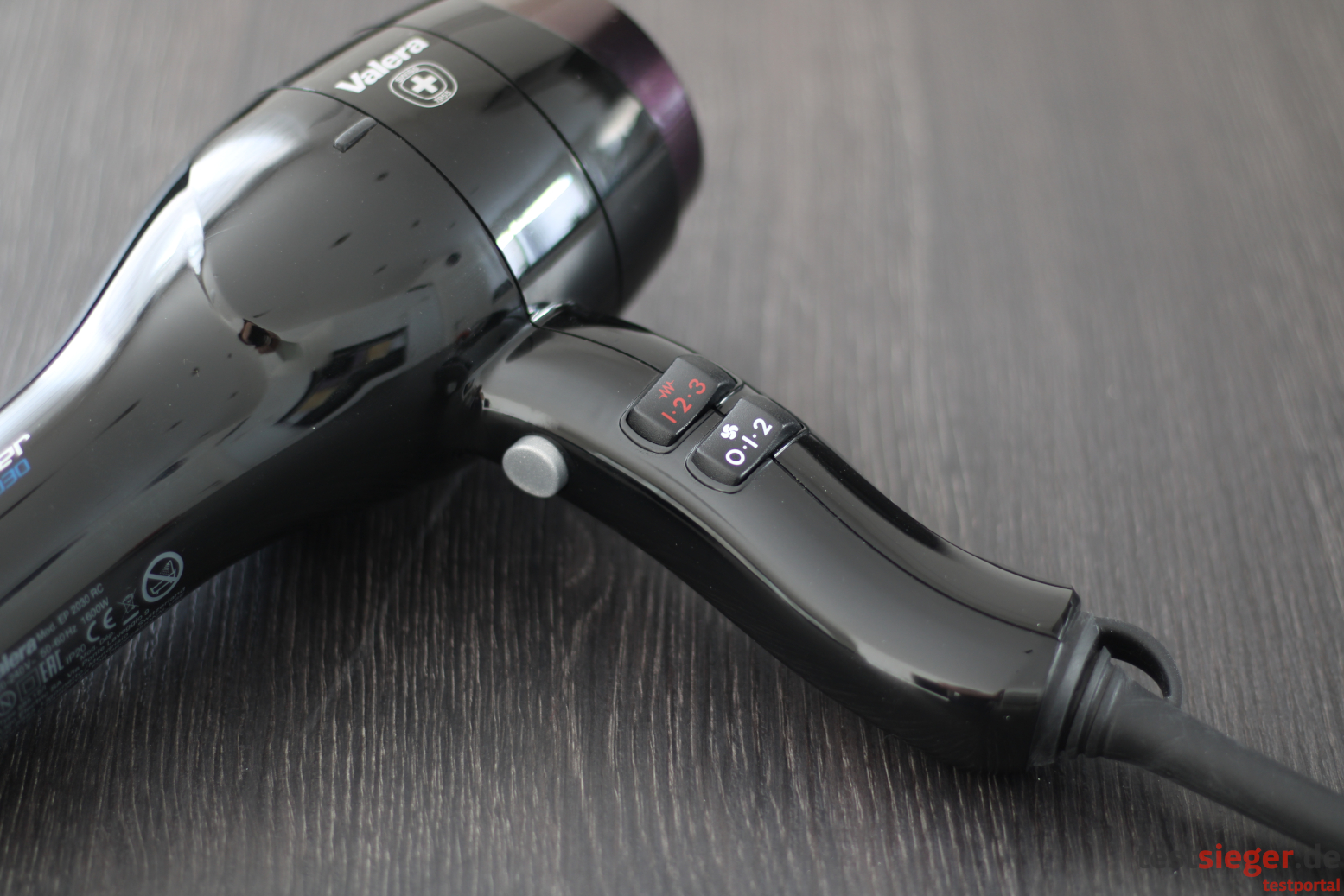 Die Bedienungsanleitung beinhaltet Hinweise für mehrere Valera-Haartrockner und ist daher zunächst etwas verwirrend. Allerdings ist die Bedienung so einfach und selbsterklärend, dass die Anleitung nicht unbedingt nötig ist. Der epower verfügt über zwei dreistufige Kippschalter an der Seite des Griffs, die der Daumen der rechten Hand bequem erreicht. Linkshänder verwenden dagegen einen oder zwei der restlichen vier Finger, was sich nicht ganz so komfortabel anfühlt. Der obere Schalter regelt die Temperatur in drei, der untere den Luftstrom in zwei Stufen, was summa summarum 6 unterschiedliche Leistungsstufen ergibt. Beide Tasten haben einen festen Druckpunkt, damit der Nutzer sie im Betrieb nicht versehentlich betätigt. Unserer Meinung nach reagieren sie jedoch einen Tick zu schwergängig. An der Innenseite des Griffs befindet sich noch die Kaltlufttaste. Die lässt sich mit beiden Händen angenehm betätigen und besitzt einen perfekten Druckpunkt.