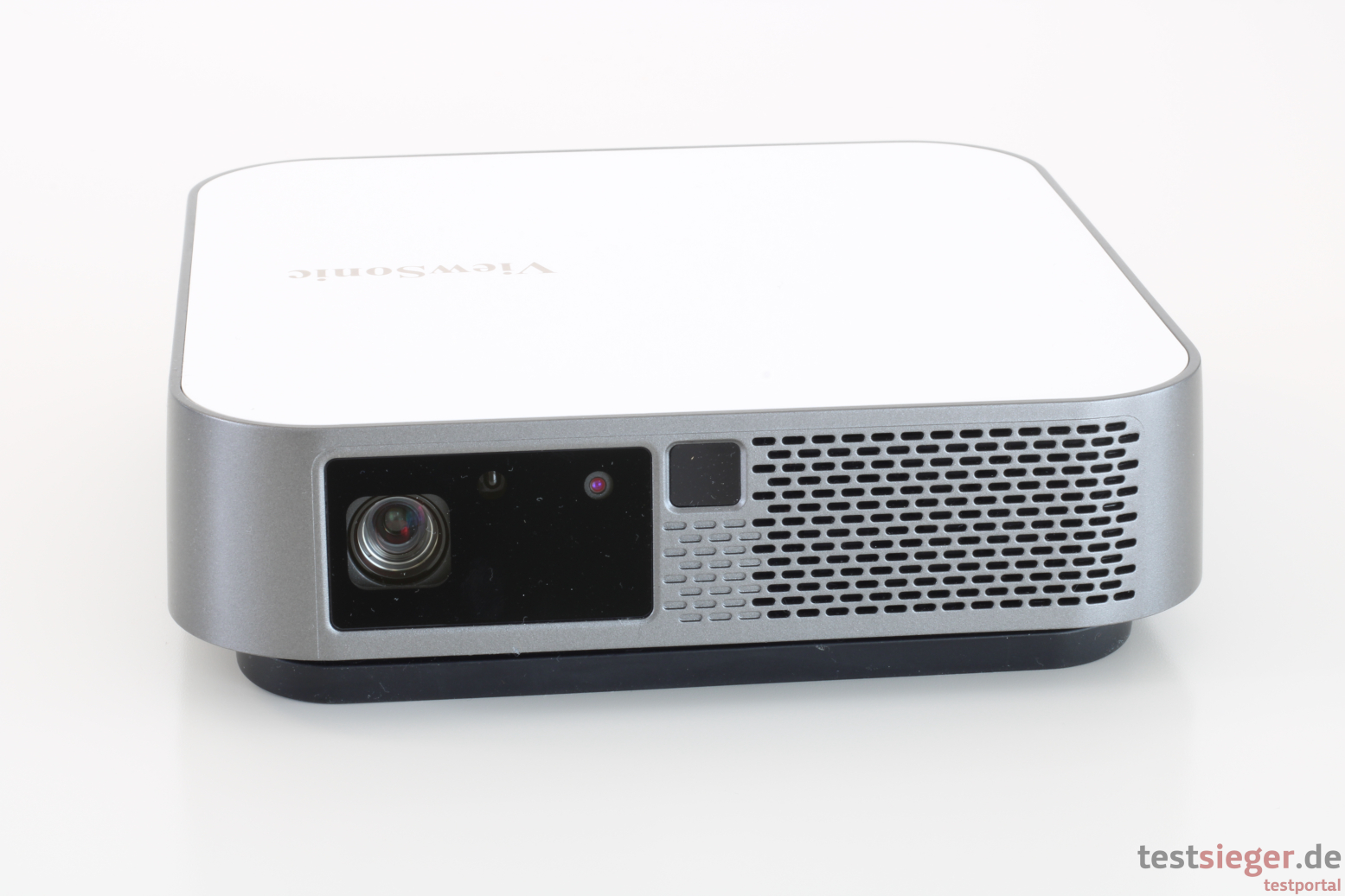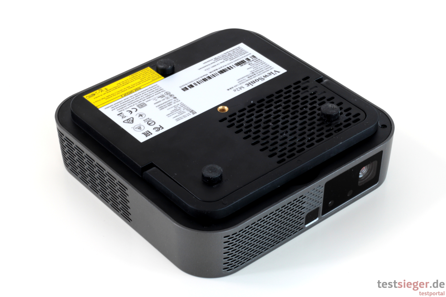 Die Verarbeitungsqualität gibt ebenfalls keinen Anlass zur Kritik. Die Seitenwände bestehen aus einem Guss und schließen perfekt mit der Oberseite ab. Wir spüren am Übergang nicht den Hauch eines Grats oder einer Unebenheit – perfekt. Die Kanten sind sehr sauber verarbeitet, Produktionsrückstände oder ähnliches sind nicht vorhanden. Das gleiche gilt für auffällig große Spaltmaße. Die drei kleinen Standfüße sind leicht gummiert und sorgen für einen guten Halt. Zwar lässt sich der Projektor noch problemlos verschieben, allerdings bringen ihn versehentliche Stöße oder andere Erschütterungen nicht gleich ins Wanken. Dank entsprechendem Gewinde lässt sich der Projektor auch auf einem Stativ montieren.