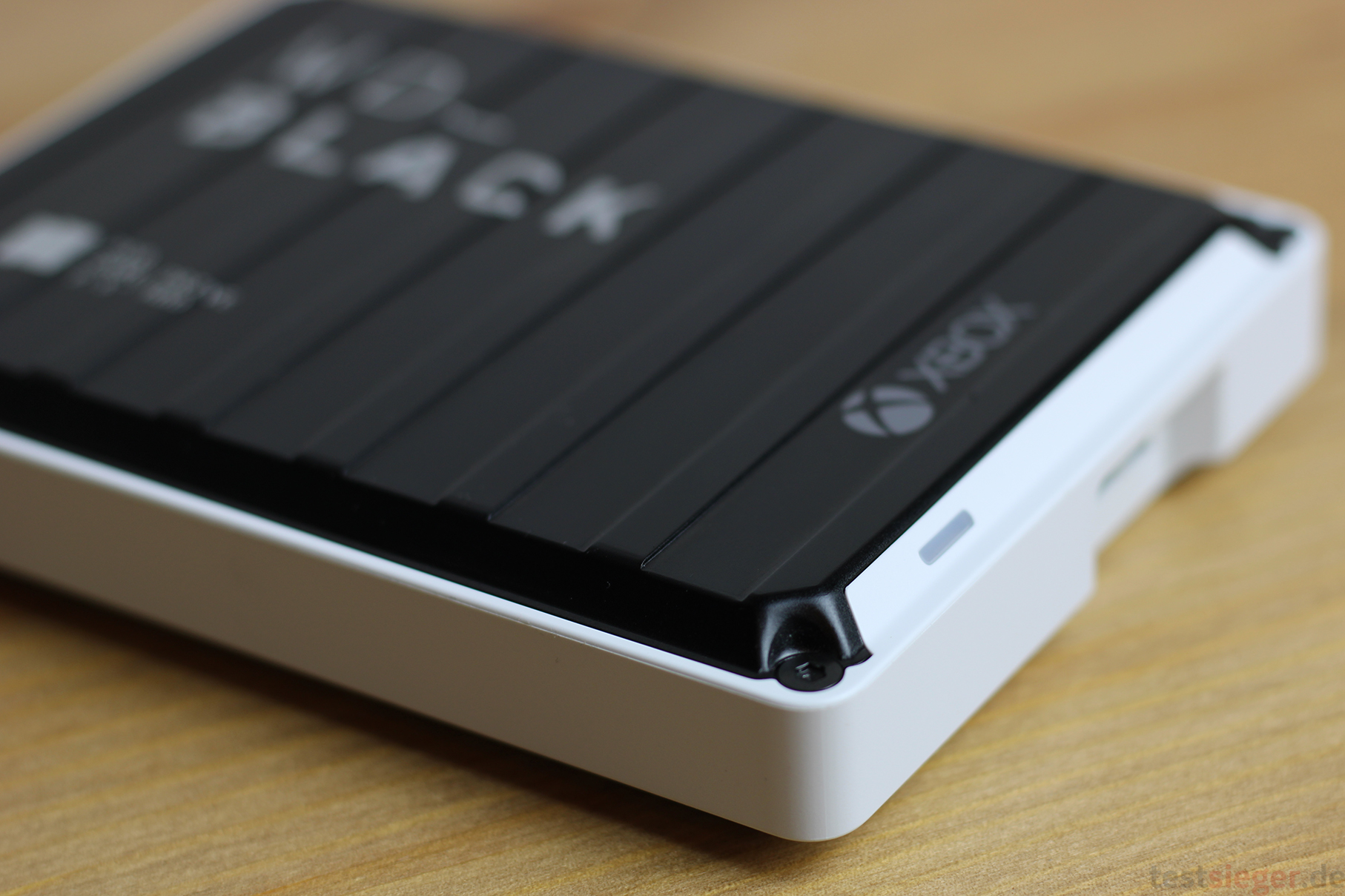 Im Gegensatz zur herkömmlichen Black P10 ist die Xbox-Variante nicht komplett in Schwarz gehalten. Einzig die Oberseite erinnert noch an den großen Bruder. Die Seitenteile und die Unterseite erstrahlen dagegen in weiß. Die Optik ist natürlich Geschmackssache, uns persönlich spricht die Schwarz-Weiße-Variante etwas mehr an. Die Formgebung ist dagegen komplett identisch. Mit einer Höhe von 14,5 Zentimetern und einer Breite von 8,7 Zentimeter ist die Fläche angenehm kompakt ausgefallen. Allerdings ist die P10 mit knapp zwei Zentimeter für eine 2,5-Zoll-Festplatte recht dick.
