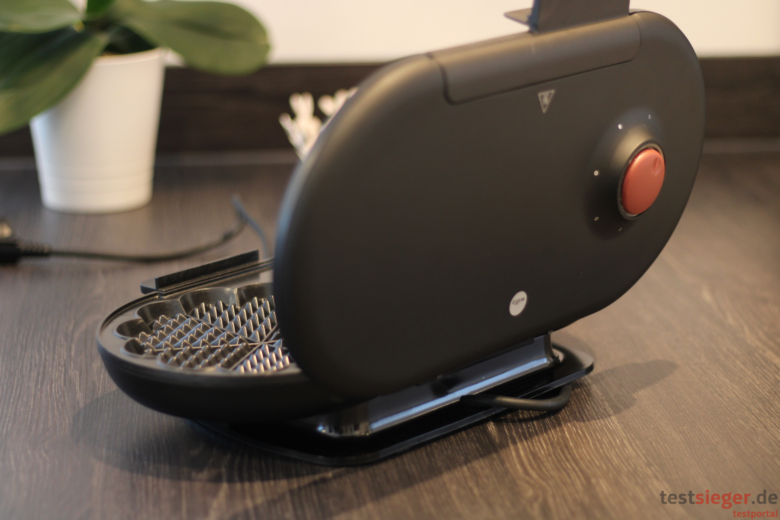 Auf den ersten Blick wirkt das Wilfa HEARTS19 wertig. Das insgesamt recht hohe Gewicht kommt vor allem durch die massiven gusseisernen Platten zustande. Davon abgesehen besteht das Gehäuse aus Kunststoff, der jedoch ebenfalls einen sehr wertigen Eindruck macht. Die Achillesferse des Waffeleisens ist jedoch der großflächige Standfuß. Der hier verwendete Kunststoff wirkt deutlich weniger robust, was sich schon daran zeigt, dass direkt beim Auspacken ein großes Stück herausgebrochen ist. So etwas kann beim Transport natürlich passieren, zeugt aber nicht von hoher Qualität. Unser zweiter Kritikpunkt ist das sehr wackelige Scharnier zum Aufklappen des Deckels. Dadurch lässt sich das Waffeleisen zwar sehr einfach öffnen, allerdings hätten wir uns trotzdem eine stabilere Variante gewünscht.