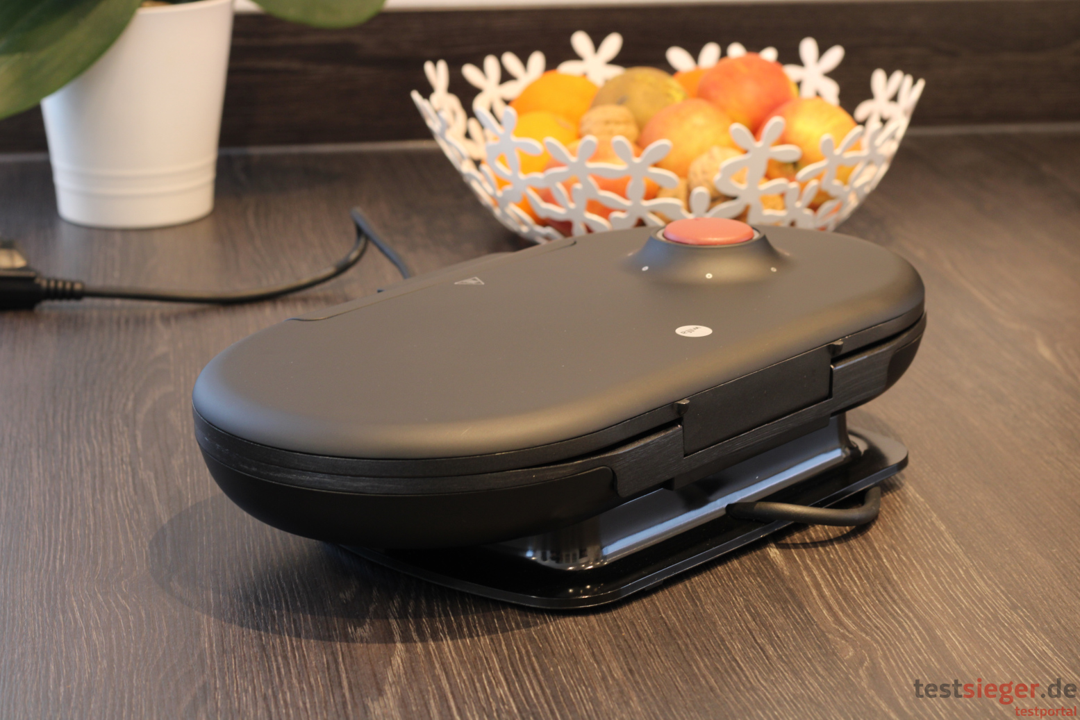 Die Optik ist vor allem durch die nebeneinander liegenden Waffelformen geprägt. Dementsprechend ist das Wilfa HEARTS19 mit 39 Zentimetern recht breit. Trotzdem liegen die Abmessungen mit einer Tiefe von 23 Zentimetern und einer Höhe von 10,5 Zentimetern voll im Rahmen und das Waffeleisen sollte problemlos Platz finden. Der Hersteller bietet zwei Farbvarianten an: Weiß und Schwarz. Unser schwarzes Testgerät kommt recht zurückhaltend daher und wirkt edel. Der weinrote Drehschalter zur Temperaturregelung lockert die Farbeinheit etwas auf. Es dominieren klare Formen, die linke und rechte Seite sind stark abgerundet. Aus unserer Sicht ergibt sich ein stimmiges Gesamtbild.