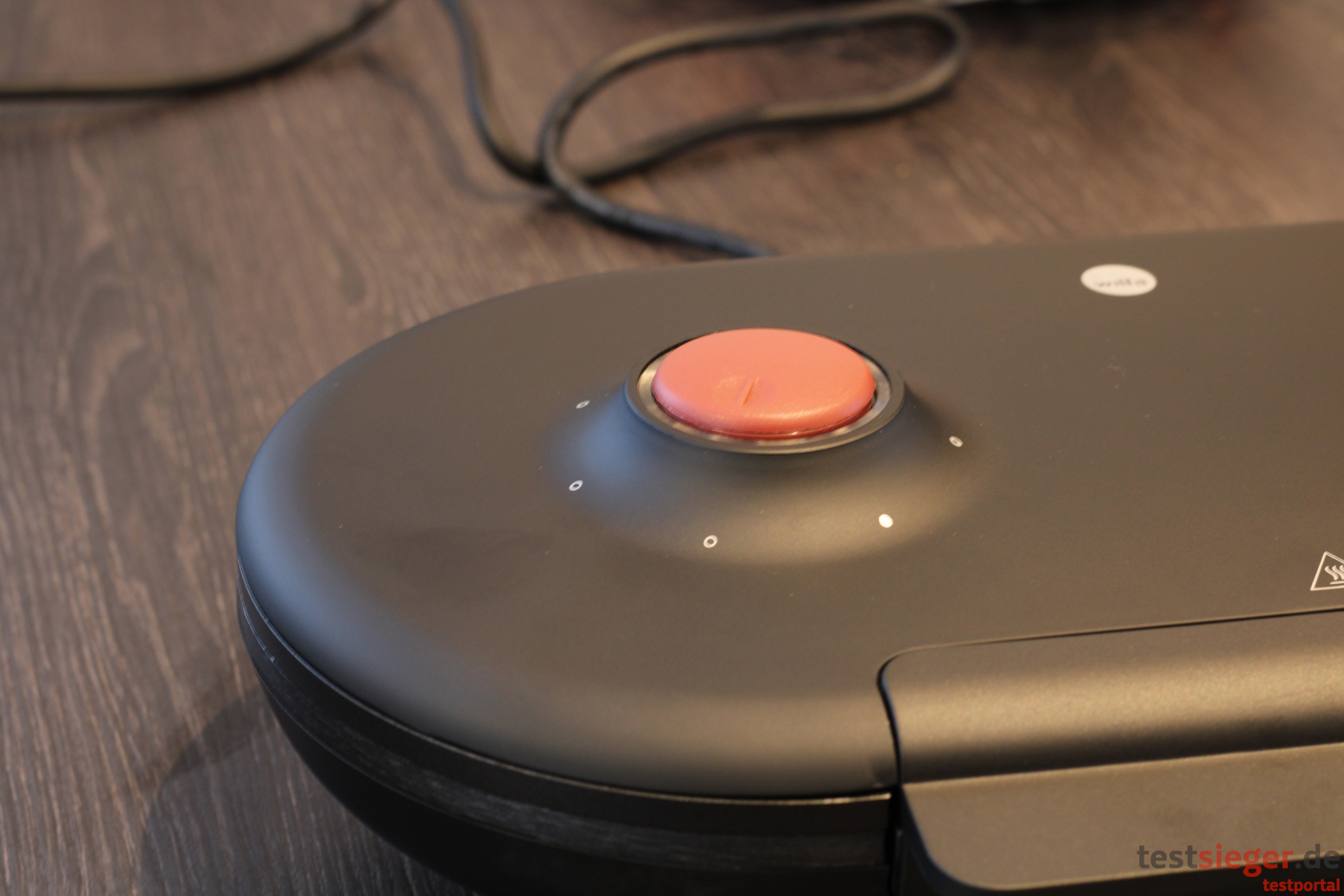 Bedienung und Handhabung sind schnell erlernt, im Zweifel hilft die ausführliche Anleitung weiter. Über das Drehrad auf der Oberseite stellen Nutzerinnen und Nutzer die Temperatur in sechs Stufen ein. Der Knopf ist angenehm leichtgängig, Einrastpunkte auf den einzelnen Stufen sind jedoch nicht vorhanden. Sobald Strom fließt, erstrahlt auch der Leuchtring um das Drehrad. Auf Stufe 0 leuchtet er grün, das Waffeleisen befindet sich im Standby-Modus. Sobald der Zeiger auf einer der sechs Hitzestufen steht, wechselt die Farbe zu Orange, und die Aufheizphase startet. Sobald die Farbe wieder zu Grün springt, ist das Waffeleisen betriebsbereit und das Backen kann beginnen.