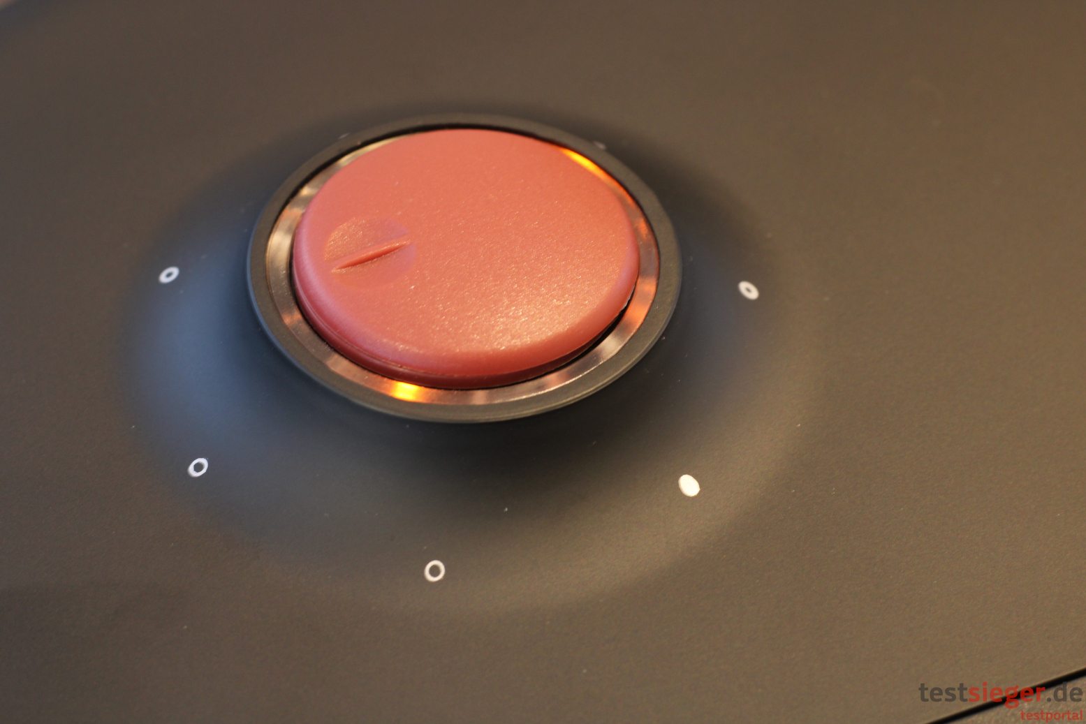 Bedienung und Handhabung sind schnell erlernt, im Zweifel hilft die ausführliche Anleitung weiter. Über das Drehrad auf der Oberseite stellen Nutzerinnen und Nutzer die Temperatur in sechs Stufen ein. Der Knopf ist angenehm leichtgängig, Einrastpunkte auf den einzelnen Stufen sind jedoch nicht vorhanden. Sobald Strom fließt, erstrahlt auch der Leuchtring um das Drehrad. Auf Stufe 0 leuchtet er grün, das Waffeleisen befindet sich im Standby-Modus. Sobald der Zeiger auf einer der sechs Hitzestufen steht, wechselt die Farbe zu Orange, und die Aufheizphase startet. Sobald die Farbe wieder zu Grün springt, ist das Waffeleisen betriebsbereit und das Backen kann beginnen.