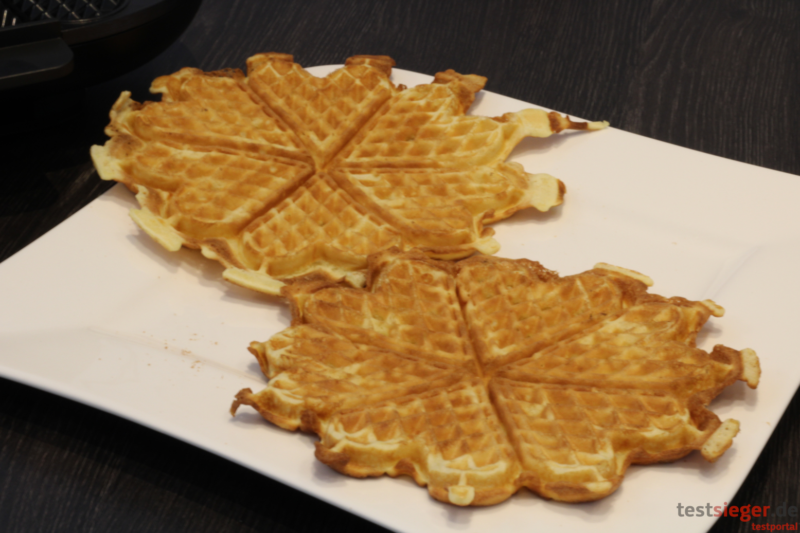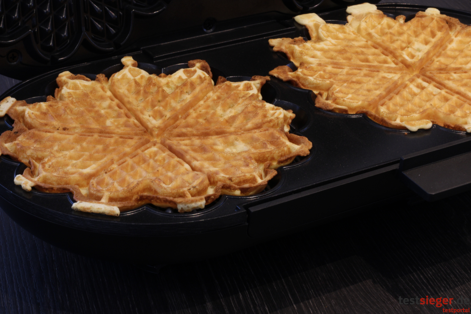 Im Inneren messen wir nach der Aufheizphase eine Temperatur von knapp 200 Grad Celsius. Dementsprechend stark dampf das Waffeleisen nach dem Zuklappen. Der Dampf kann jedoch gut entweichen und die Feuchtigkeit bleibt nicht im Inneren des Waffeleisens zurück. Aufgrund der hohen Temperatur haben die Waffeln bereits nach circa 1,5 Minuten eine leichte Bräunung. Nach zwei Minuten sind sie stark gebräunt, nach drei Minuten liegt ein dunkles, sehr krosses Ergebnis vor. Dabei ist die Bräunung recht gleichmäßig, nur an den Rändern bleiben die Waffeln teilweise etwas heller. Insgesamt sind wir mit den Ergebnissen sehr zufrieden. Dank der Antihaftbeschichtung lassen sich die fertigen Waffeln problemlos aus der Form lösen und es bleiben so gut wie keine Rückstände. Dementsprechend müssen Nutzerinnen und Nutzer das Eisen vor dem Gebrauch noch nicht einfetten.