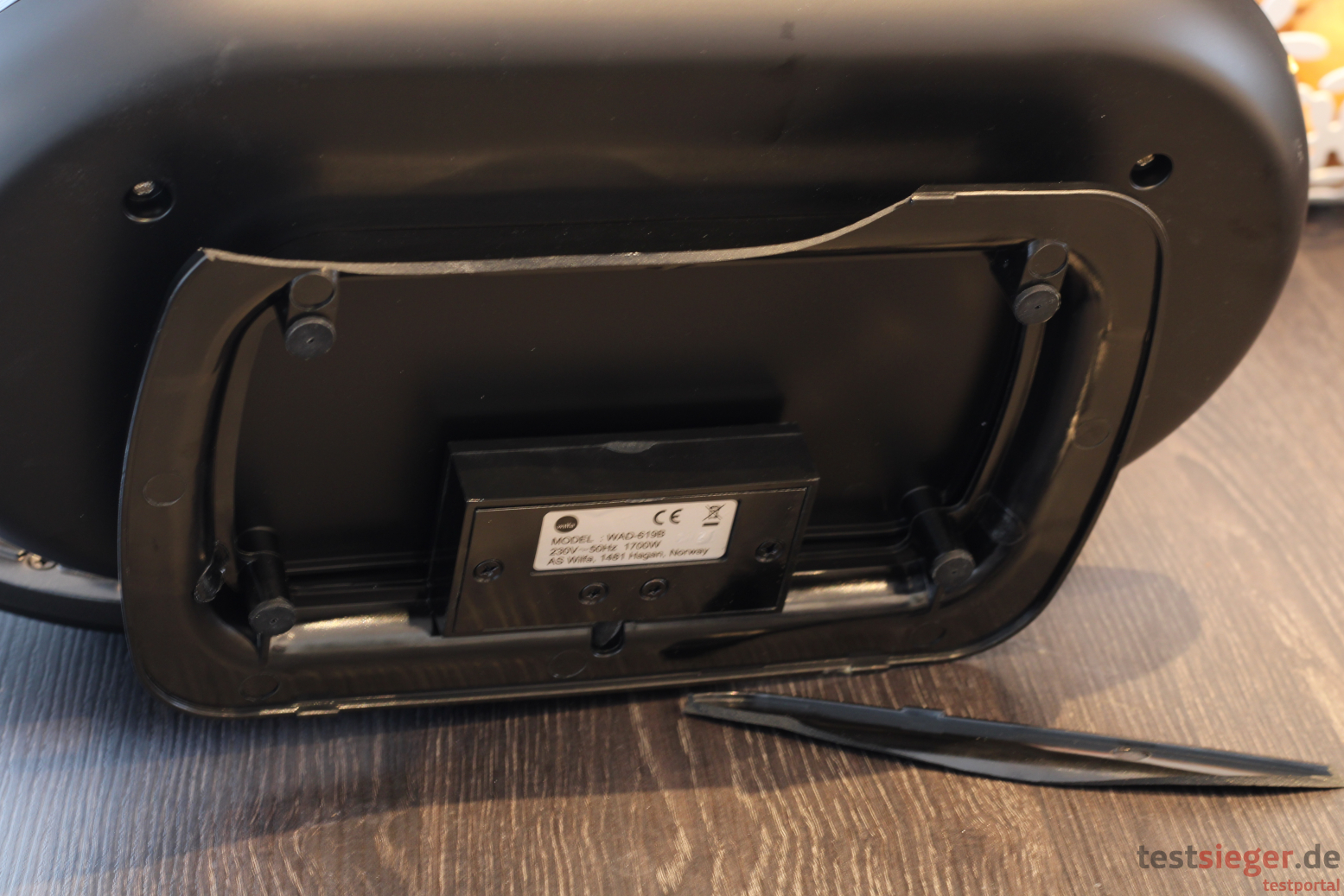 Auf den ersten Blick wirkt das Wilfa HEARTS19 wertig. Das insgesamt recht hohe Gewicht kommt vor allem durch die massiven gusseisernen Platten zustande. Davon abgesehen besteht das Gehäuse aus Kunststoff, der jedoch ebenfalls einen sehr wertigen Eindruck macht. Die Achillesferse des Waffeleisens ist jedoch der großflächige Standfuß. Der hier verwendete Kunststoff wirkt deutlich weniger robust, was sich schon daran zeigt, dass direkt beim Auspacken ein großes Stück herausgebrochen ist. So etwas kann beim Transport natürlich passieren, zeugt aber nicht von hoher Qualität. Unser zweiter Kritikpunkt ist das sehr wackelige Scharnier zum Aufklappen des Deckels. Dadurch lässt sich das Waffeleisen zwar sehr einfach öffnen, allerdings hätten wir uns trotzdem eine stabilere Variante gewünscht.