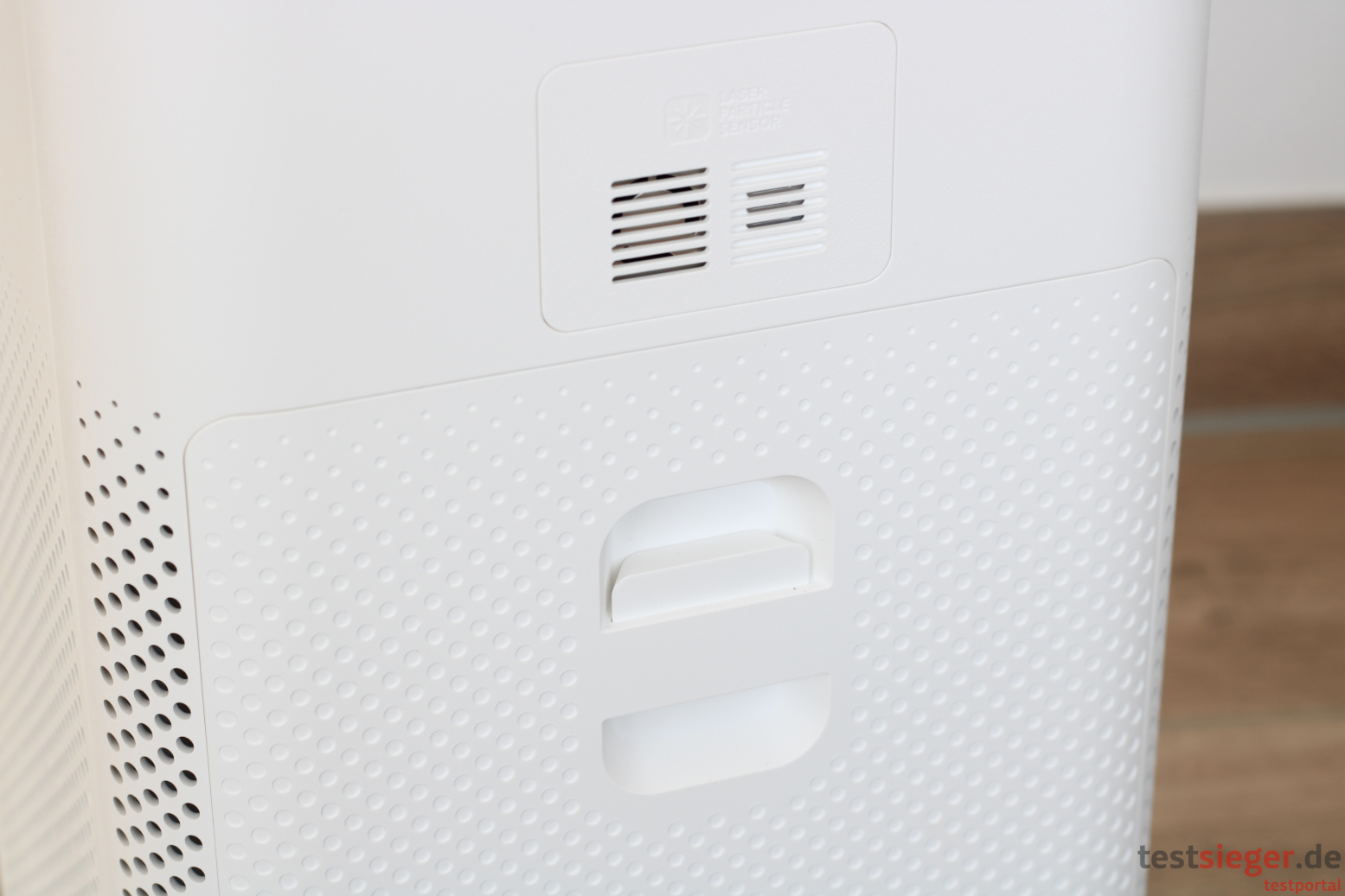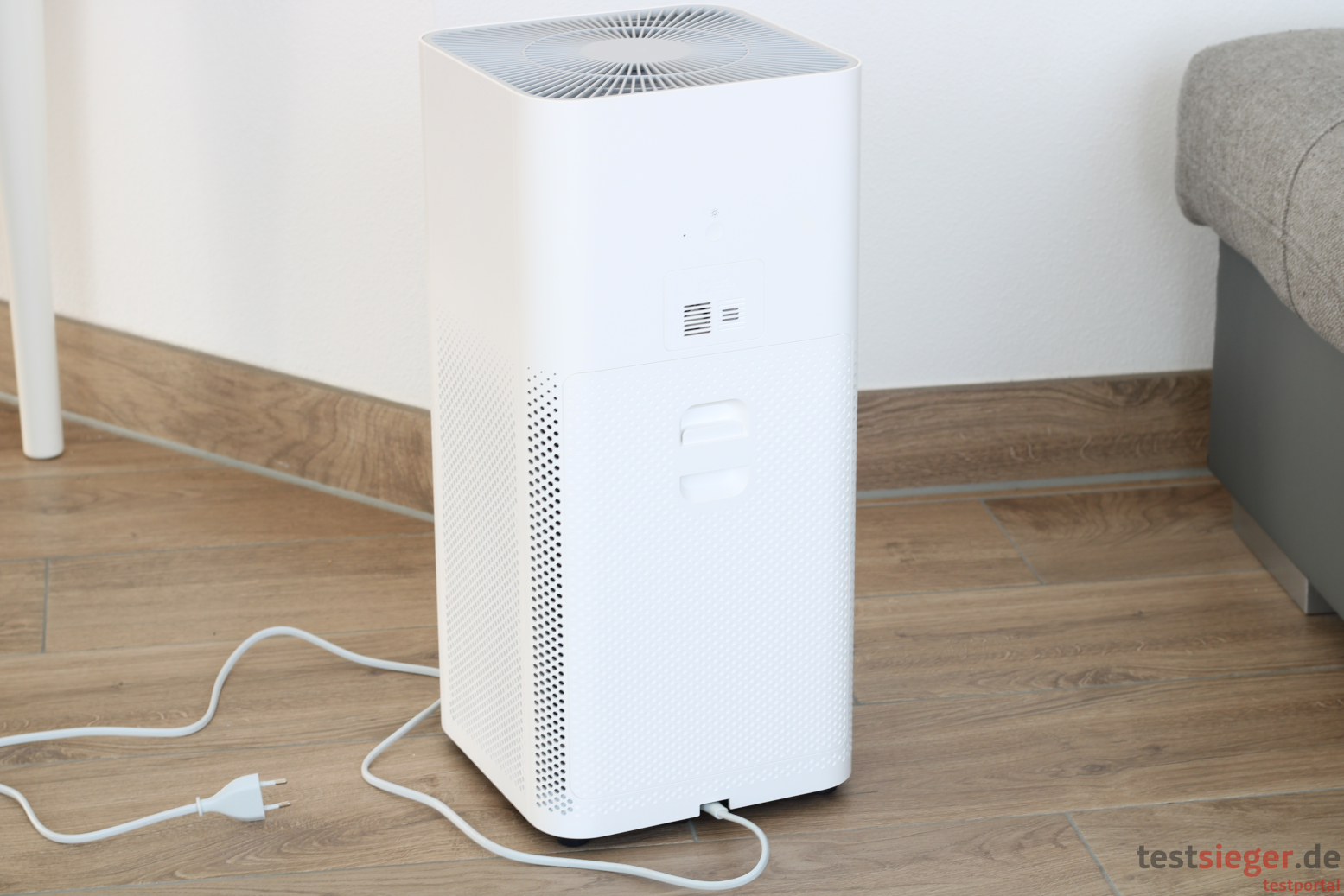 Optisch präsentiert sich der Xiaomi Mi Air Purifier 3H in edlem Weiß. In Kombination mit den beachtlichen Abmessungen von 52 Zentimetern in der Höhe, 24 Zentimetern in der Tiefe und 24 Zentimetern in der Breite ist der Luftreiniger schon ein Blickfang. Die Optik ist natürlich Geschmackssache, uns gefällt der 3H jedoch sehr gut. Die rechteckige Bauform mit den abgerundeten Kanten punktet durch eine klare Linienführung. Die sich fast um das gesamte Gehäuse ziehende Perforierung zum Lufteinlass bringt einen Hauch wohltuender Verspieltheit. Dementsprechend muss sich der Luftreiniger definitiv nicht verstecken und kann, frei im Raum stehend, seine optimale Leistung entfalten.Die Verarbeitungsqualität liegt ebenfalls in einem guten Bereich. Wir entdecken keine Produktionsrückstände oder scharfe Kanten. Alle Komponenten wie zum Beispiel das Laufauslassgitter auf der Oberseite sind sauber miteinander verbunden. Das Gehäuse besteht nahezu komplett aus Kunststoff. An den perforierten Stellen, die gut zwei Drittel des Geräts ausmachen, ist das Material jedoch recht weich und lässt sich leicht eindrücken. Dafür ist der 3H mit einem Gewicht von knapp 5 Kilogramm für einen Luftreiniger auch nicht übermäßig schwer und lässt sich auch gut von Etage zu Etage transportieren. Vier Standfüße mit Antirutschelementen sollen für einen festen Halt auf dem Untergrund sorgen. In der Praxis lässt sich der Mi Air Purifier aber trotzdem ohne größeren Kraftaufwand verschieben. Zudem kann er bei festeren Stößen bauartbedingt auch umkippen. Bei Erwachsenen ist das natürlich kein Problem, wer jedoch Kleinkinder im Haus hat, sollte den Reiniger eventuell etwas höher aufstellen.