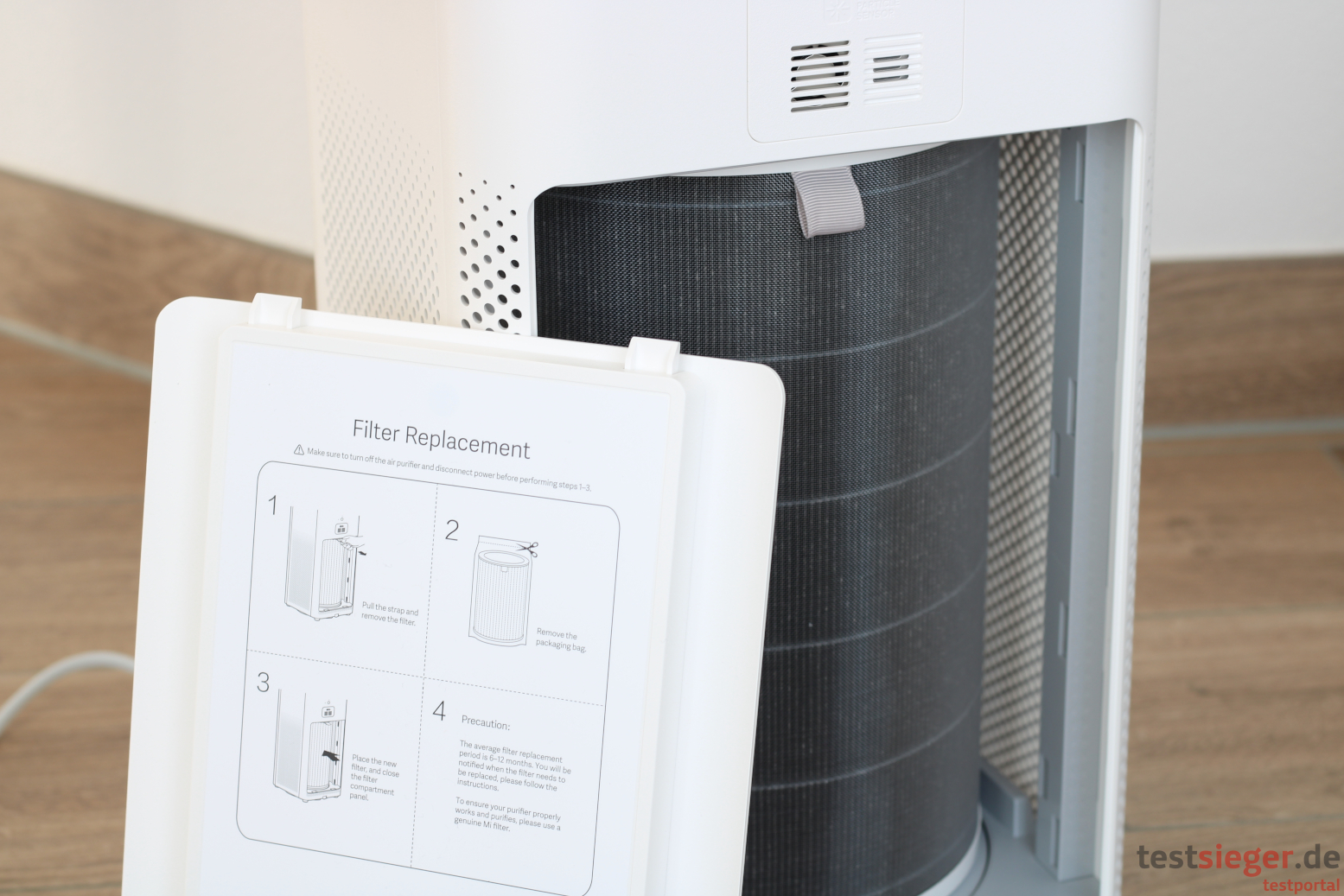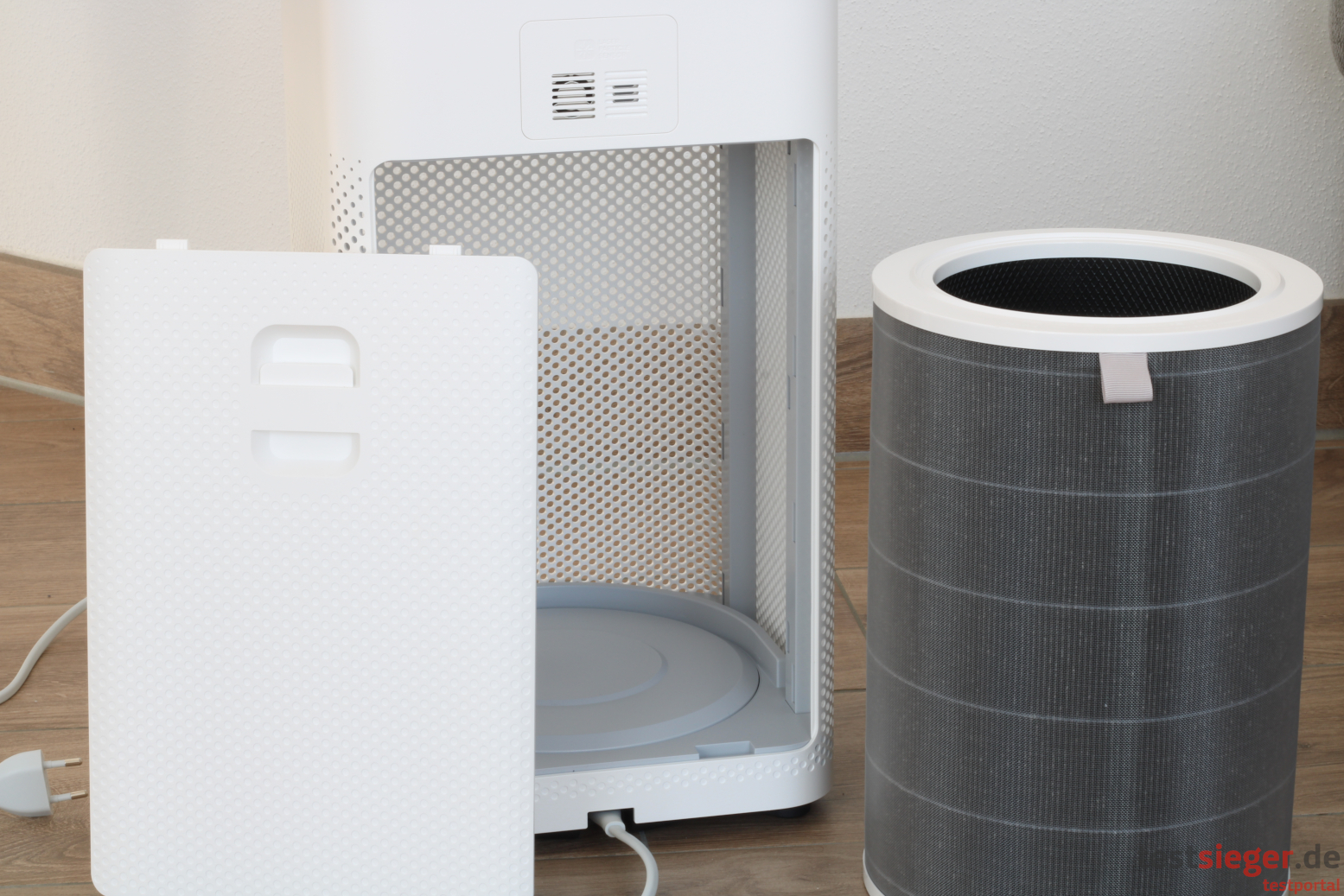 Die Inbetriebnahme könnte einfacher nicht sein. Der Luftreiniger kommt bereits komplett montiert, auch der dreilagige HEPA-Filter ist bereits integriert. Beim Durchsuchen der Verpackung fragen wir uns zunächst, ob der Hersteller das Stromkabel vergessen hat. Ein Blick in die solide Anleitung klärt die Situation. Das Kabel befindet sich hinter der Wartungsklappe auf der Rückseite. Die Strippe bietet mit knapp 1,40 Metern eine ordentliche Flexibilität, ein paar Zentimeter mehr hätten jedoch sicherlich nicht geschadet. Insgesamt besteht das Gerät nur aus drei getrennten Teilen. Die Rückabdeckung lässt sich sehr einfach über einen Schiebeschalter entfernen und genauso einfach wieder anbringen. Über einen Klickmechanismus rastet sie sehr fest ein und schließt bündig mit dem restlichen Gehäuse ab. Sie verbirgt den großen zylinderförmigen Dreifachfilter. Über eine kleine Lasche lässt sich dieser zur Reinigung sehr einfach herausziehen. Dementsprechend bereit die Handhabung keine Probleme.