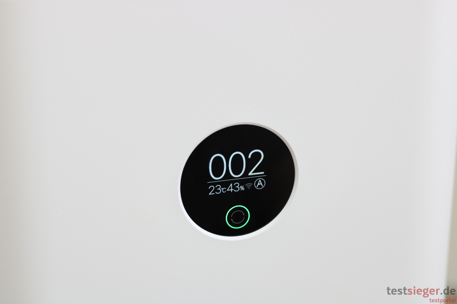 Das gleiche gilt für die Bedienung. Der Mi Air Purifier 3H verfügt über zwei Tasten und ein OLED-Display. Gerade letzteres ist bei Luftreinigern nicht unbedingt üblich, häufig begnügen sich diese mit einem alphanumerischen Bildschirm. Unter dem Display findet sich die berührungsempfindliche Power- und Programmwahltaste. Ein kurzer Druck und der Reiniger nimmt standardmäßig im Automatikprogramm den Dienst auf. Wer die anderen Programme wählen möchte, muss diese über den Knopf durchschalten. Zu Wahl stehen ein Nachtmodus, drei Leistungsstufen und ein manueller Modus, der sich jedoch nur über die zugehörige Mi-Home-Anwendung personalisieren lässt. Trotzdem ist ein App-Zwang nicht gegeben, was wir sehr begrüßen. Der Air Purifier 3H lässt sich auch problemlos ohne die Zusatzfunktionen verwenden. Wem das Display gerade nachts zu hell sein sollte, der kann es über einen physischen Knopf auf der Rückseite entweder dimmen oder komplett ausschalten. Neben dem aktuell gewählten Programm, zeigt der Bildschirm noch die Luftqualität, die Temperatur im Raum und die Luftfeuchtigkeit an.