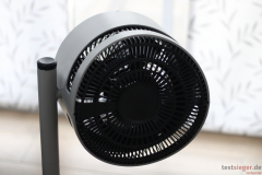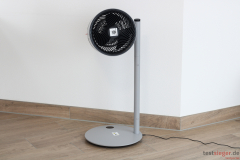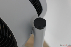 Bedienung und Handhabung bereiten uns im Ventilator-Test keine Probleme und sind nahezu selbsterklärend. Über ein Drehgelenk lässt sich die Trommel um bis zu 270 Grad nach oben und unten verstellen. So entscheiden wir ganz nach persönlichem Gusto, ob der Ventilator die Luft zur Seite oder nach oben als Air Shower abgeben soll. Eine Schwenkfunktion ist jedoch nicht vorhanden. Hier bleibt nichts anderes übrig, als den gesamten Ventilator zu drehen, was nicht sonderlich komfortabel ist. Ein manueller Schwenkmodus an der Basisstange hätte hier aus unserer Sicht sehr geholfen. Der Stromanschluss befindet sich im Standfuß, das Gestänge leitet die Energie weiter zur Turbine. Das Kabel ist schön lang und garantiert eine hohe Flexibilität.
