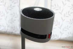 Mit der Verlängerungsstange und nach oben gerichteter Trommel kommt der Boneco auf eine Höhe von circa 85 Zentimetern. Ohne das Modul eignet sich der F225 auch als Tischventilator, auch wenn Nutzerinnen und Nutzer einiges an Grundfläche einplanen müssen. Der runde Standfuß hat einen Durchmesser von 37,5 Zentimetern. Die voluminöse Trommel misst 29 Zentimeter in der Breite, 28 Zentimeter in der Höhe und knapp 25 Zentimeter in der Tiefe.