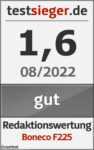 Der Boneco F225 ist ein leistungsfähiger Ventilator mit vielen Funktionen. Über die 32 Stufen lässt sich der Luftstrom sehr fein regeln. Die Bedienung ist durchdacht und geht gut von der Hand. Eine Fernbedienung ist jedoch nicht im Lieferumfang, hier muss das Smartphone herhalten. Die Steuerung über die Boneco-App klappt jedoch ebenfalls sehr gut. Die Verarbeitungsqualität macht auch einen guten Eindruck, beim Thema Sicherheit und Stromverbrauch lässt sich der F225 ebenfalls nichts zuschulden kommen. Dementsprechend können wir eine klare Kaufempfehlung aussprechen.