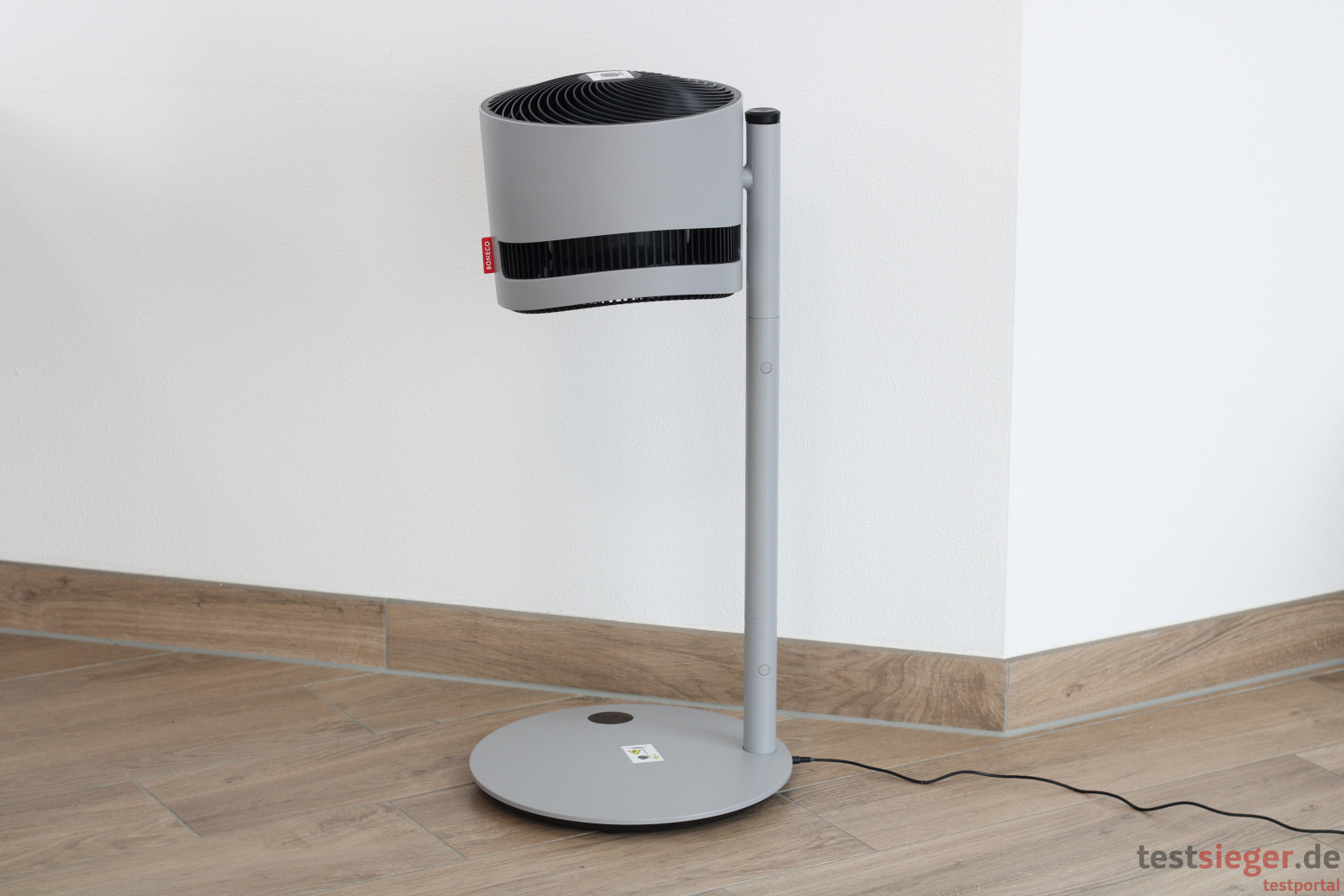 Die große Ventilatortrommel und die beiliegende Verlängerungsstange sind dagegen schön leicht. Die drei Komponenten lassen sich durch einen Steckmechanismus verbinden. Die Optik des Gesamtkonstrukts ist zunächst etwas ungewöhnlich, uns gefällt das Design des Boneco F225 jedoch. Der Ventilator ist in jedem Fall ein Hingucker und setzt einen Design-Akzent im Raum. Die Stange ist an der Seite des Standfußes angebracht, die Trommel hängt oben seitlich am Ständer.