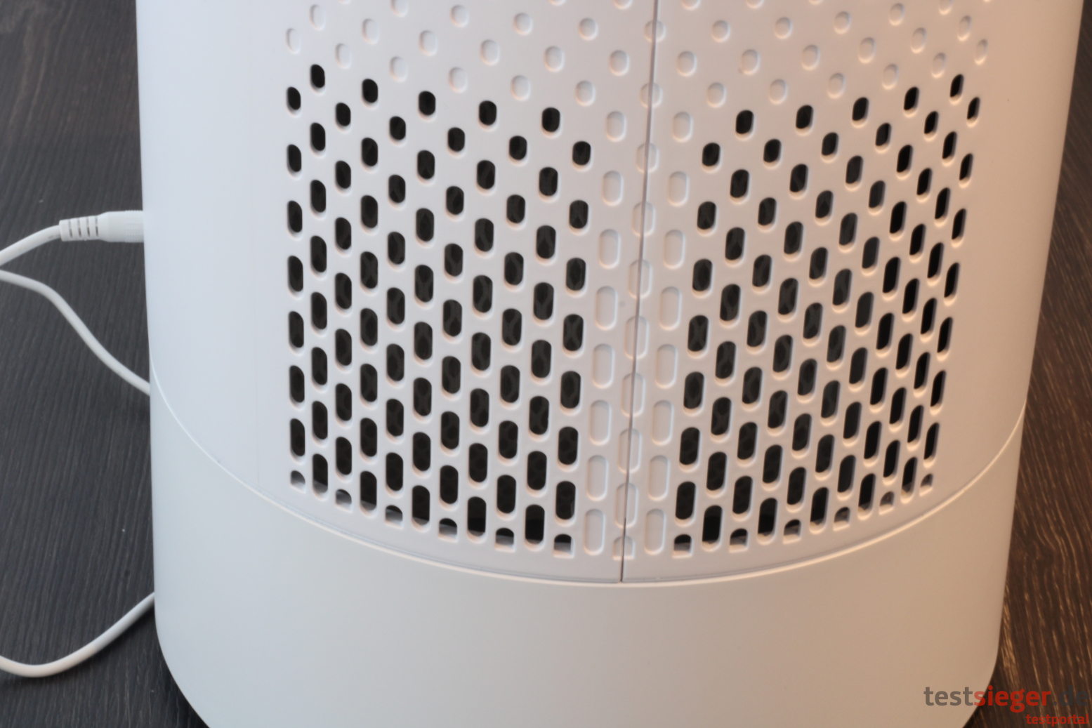 Vor der Inbetriebnahme müssen Nutzerinnen und Nutzer zunächst die Abdeckung auf der Oberseite entfernen. Dort sitzen der Vor- und der Pollenfilter. Letzterer ist jedoch für eine bessere Hygiene noch in Folie eingeschweißt. Das Abnehmen und Aufsetzen der Abdeckung funktioniert problemlos. Danach befüllen wir den Wassertank, der mit 6 Litern wie bereits erwähnt sehr großzügig bemessen ist und dementsprechend nur selten nachgefüllt werden muss. Nutzerinnen und Nutzer können entweder das obere Gehäuse abnehmen und die Wanne direkt befüllen oder sie öffnen eine kleine Klappe auf der Oberseite. Darunter befindet sich ein kleiner Trichter, der das Wasser nach unten befördert. Der Trichter ist so groß, dass das Einfüllen darüber sehr bequem funktioniert. Ein kleiner, roter Knopf signalisiert, wenn die maximale Füllmenge erreicht ist. Durch den Auftrieb lässt er sich bei zu hohem Wasserstand nicht mehr herunterdrücken. In der Praxis hakt die Funktion jedoch etwas. Bei unserer ersten Inbetriebnahme kommt der Knopf selbst bei 7 Litern Füllmenge nicht heraus. Das Resultat: Das Wasser läuft über die Wanne und den Spalt im Gehäuse aus. Im späteren Verlauf funktioniert der Anzeiger dann aber gut. Trotzdem ist etwas Vorsicht geboten und man sollte sich eher auf seinen gesunden Menschenverstand verlassen. Auf der Rückseite befindet sich ein Duftstoffbehälter auf der Rückseite. Hier lassen sich laut Hersteller handelsübliche Aromastoffe und ätherische Öle hinzugeben.