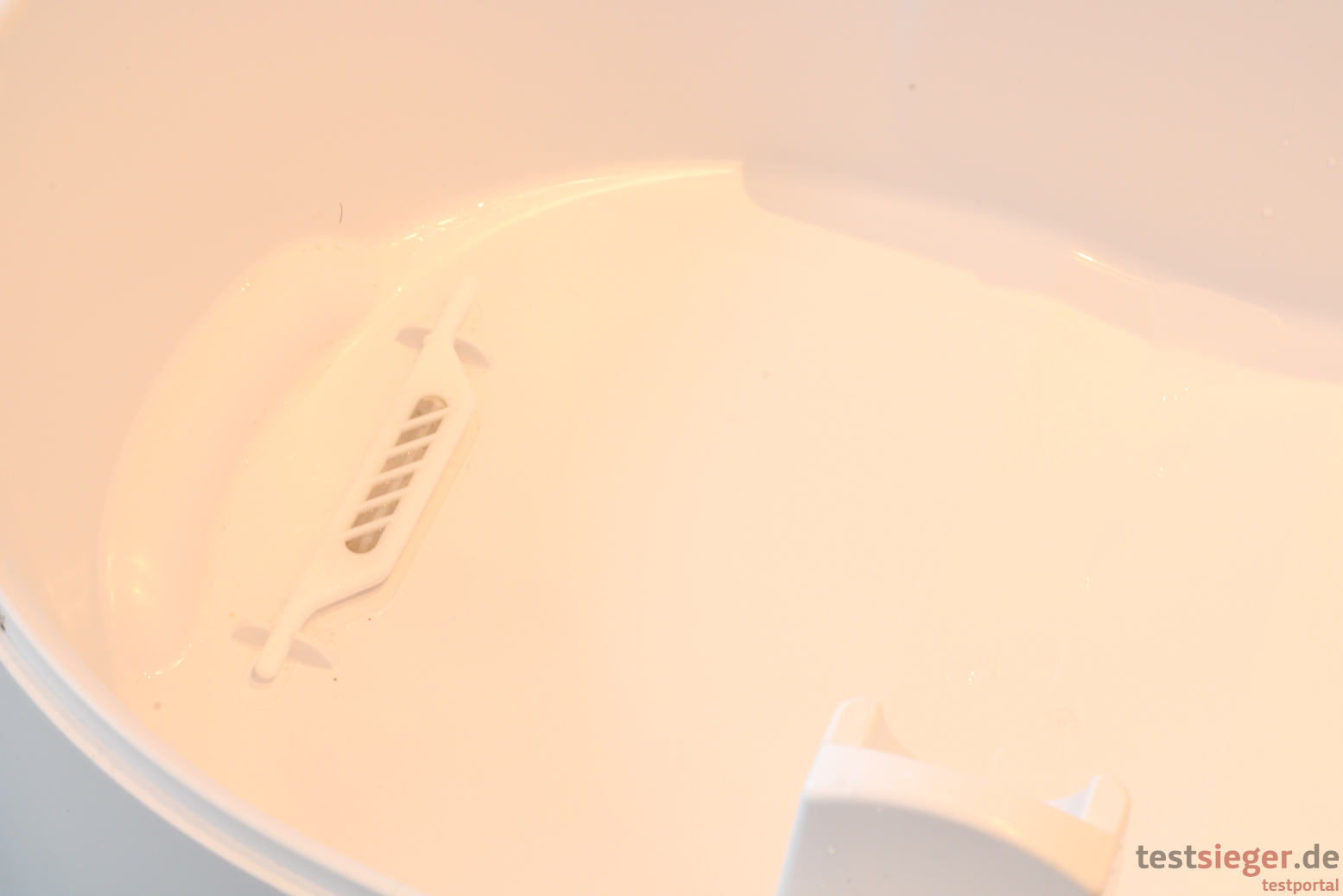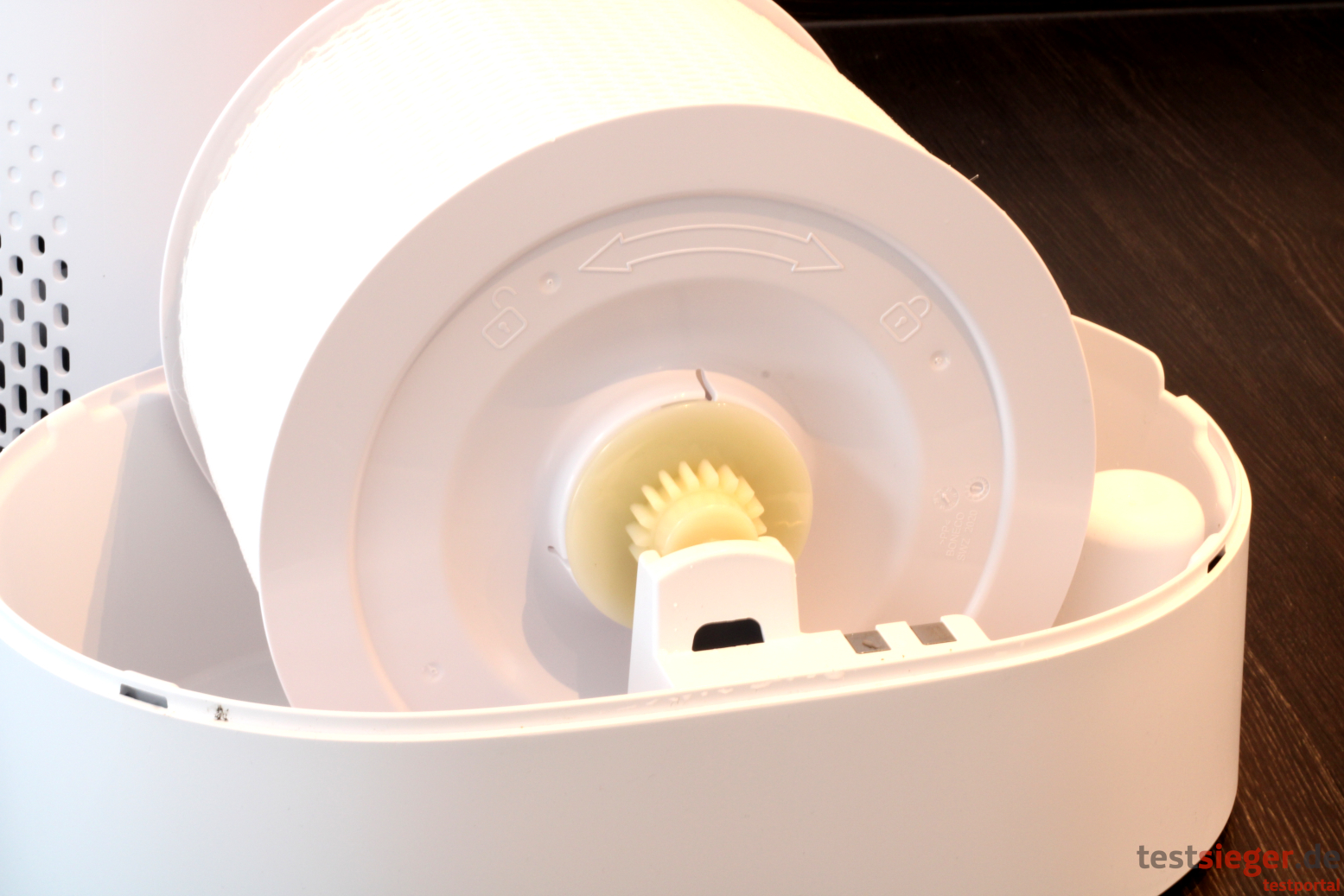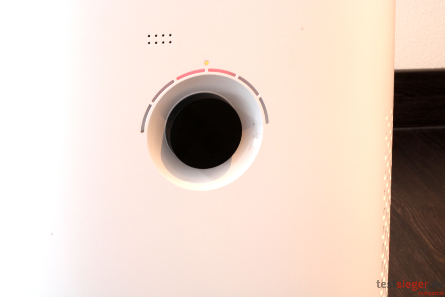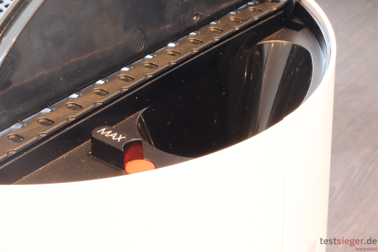 Vor der Inbetriebnahme müssen Nutzerinnen und Nutzer zunächst die Abdeckung auf der Oberseite entfernen. Dort sitzen der Vor- und der Pollenfilter. Letzterer ist jedoch für eine bessere Hygiene noch in Folie eingeschweißt. Das Abnehmen und Aufsetzen der Abdeckung funktioniert problemlos. Danach befüllen wir den Wassertank, der mit 6 Litern wie bereits erwähnt sehr großzügig bemessen ist und dementsprechend nur selten nachgefüllt werden muss. Nutzerinnen und Nutzer können entweder das obere Gehäuse abnehmen und die Wanne direkt befüllen oder sie öffnen eine kleine Klappe auf der Oberseite. Darunter befindet sich ein kleiner Trichter, der das Wasser nach unten befördert. Der Trichter ist so groß, dass das Einfüllen darüber sehr bequem funktioniert. Ein kleiner, roter Knopf signalisiert, wenn die maximale Füllmenge erreicht ist. Durch den Auftrieb lässt er sich bei zu hohem Wasserstand nicht mehr herunterdrücken. In der Praxis hakt die Funktion jedoch etwas. Bei unserer ersten Inbetriebnahme kommt der Knopf selbst bei 7 Litern Füllmenge nicht heraus. Das Resultat: Das Wasser läuft über die Wanne und den Spalt im Gehäuse aus. Im späteren Verlauf funktioniert der Anzeiger dann aber gut. Trotzdem ist etwas Vorsicht geboten und man sollte sich eher auf seinen gesunden Menschenverstand verlassen. Auf der Rückseite befindet sich ein Duftstoffbehälter auf der Rückseite. Hier lassen sich laut Hersteller handelsübliche Aromastoffe und ätherische Öle hinzugeben.