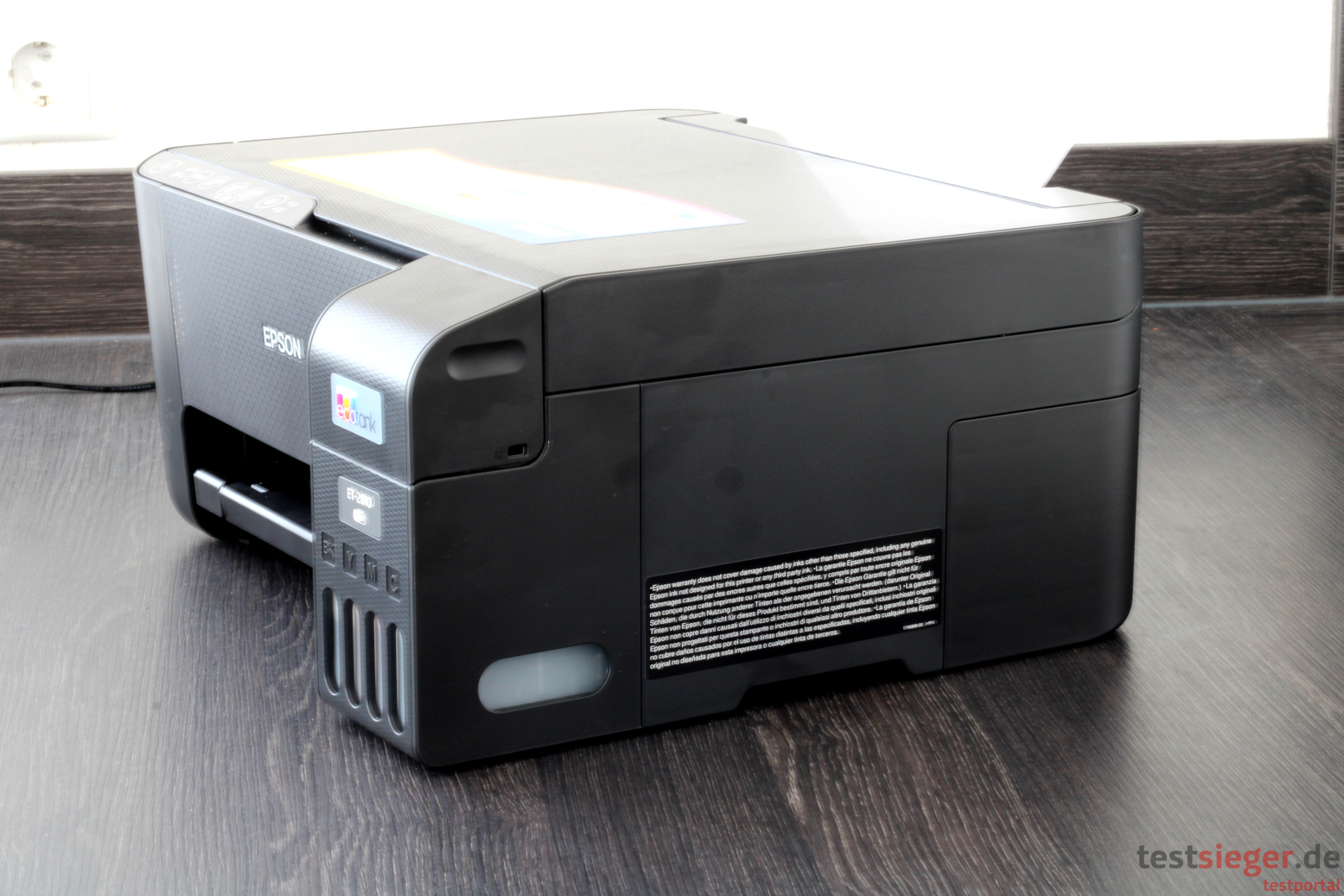 Die Verarbeitungsqualität liegt insgesamt noch in einem guten Bereich. Der verwendete Kunststoff macht auf uns einen wertigen Eindruck und ist der Preisklasse angemessen. Die verschiedenen Klappen und beweglichen Elemente klappern etwas, wenn man daran rüttelt, was in der Praxis aber nicht ins Gewicht fällt. Sie sind sauber in das Gehäuse integriert und lassen sich problemlos verwenden. Einzig die Papierausgabe ist nicht sonderlich stabil und wirkt nicht bruchfest. Außerdem haben wir beim Test einmal die Wartungsklappe an der Vorderseite an der Hand, als wir ein wenig zu stark ziehen. Sie lässt sich aber wieder gut an den entsprechenden Scharnierpunkten einsetzen. Antirutschelemente auf dem Boden des Multifunktionsgeräts sind vorhanden, trotzdem lässt sich der EcoTank ET-2810 noch problemlos verschieben. Aus unserer Sicht geht das gerade noch in Ordnung, da der Epson im Betrieb nicht stark vibriert oder gar wackelt. Trotzdem hätte eine etwas bessere Standfestigkeit nicht geschadet.