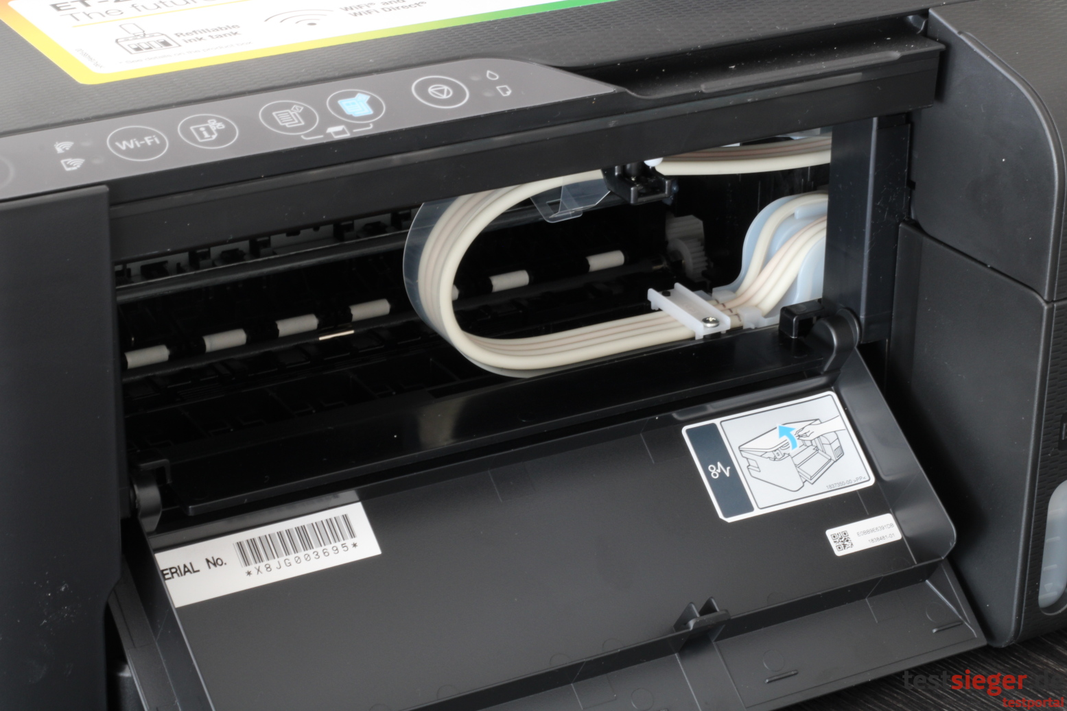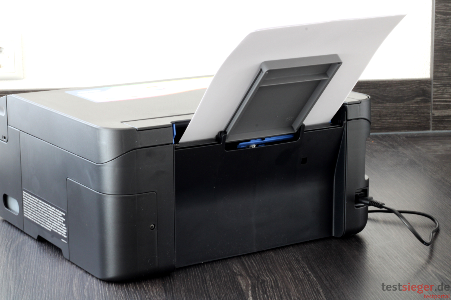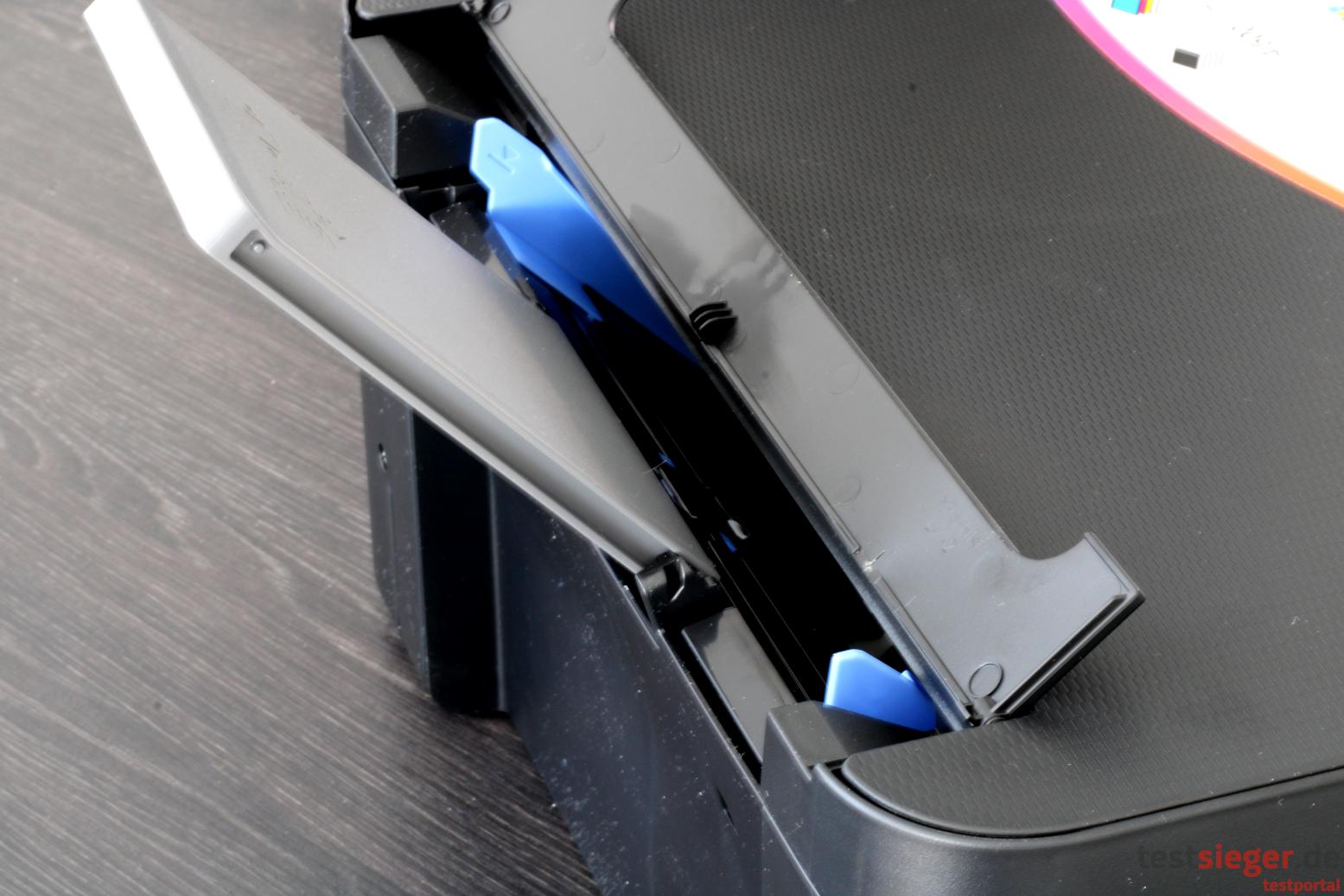 Trotzdem empfehlen wir die Verwendung der Epson-Smart-Panel-App. Die Anwendung ist logisch aufgebaut und die Bedienung bereitet uns nach kurzer Eingewöhnung keine Probleme. Wir stellen während des Tests keine Verbindungsprobleme zwischen unseren Endgeräten und dem Drucker fest. Die Papierzufuhr erfolgt auf der Oberseite. Einfach die Klappe des Einzugs öffnen und die Papierstütze nach oben ziehen. Maximal 100 Blatt Normalpapier (bis DIN-A4) finden hier Platz. Das ausziehbare Ausgabefach ist ausreichend groß, wirkt wie oben beschrieben allerdings nicht sehr stabil.