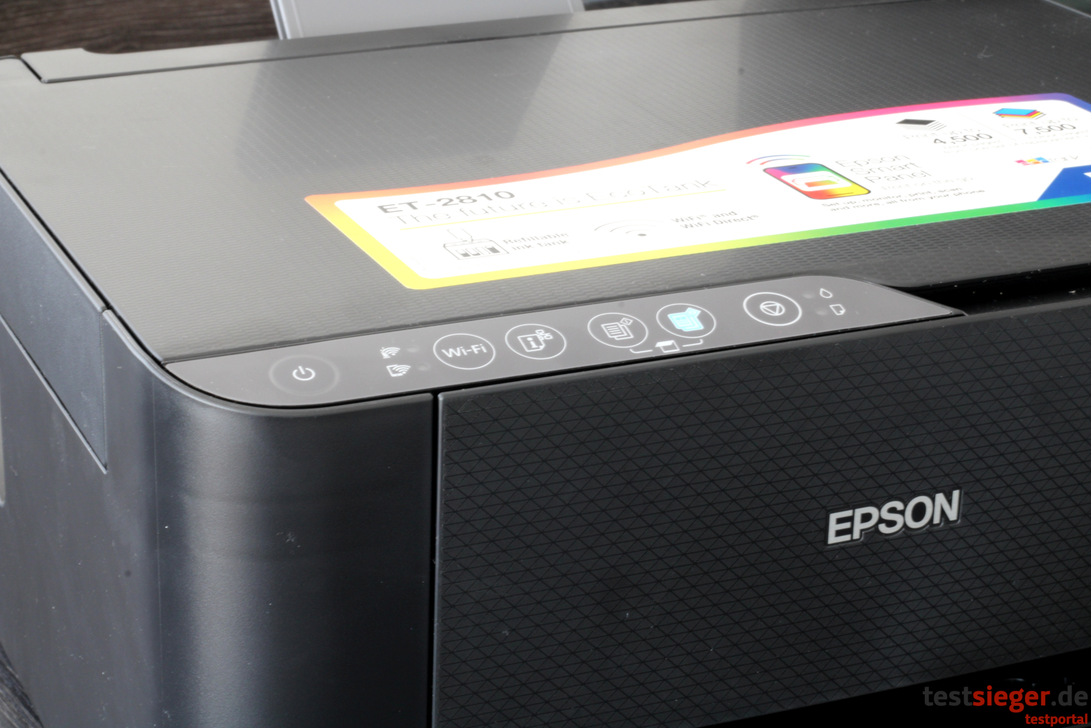 Der ET-2810 bietet alle Ausstattungsmerkmale, die wir uns in dieser Preisklasse (UVP 249,99 Euro) erwarten. Er druckt mit einer hohen Maximalauflösung von 5.760 x 1.440 dpi, scannt mit maximal 1.200 x 2.400 dpi und kopiert. Wie bereits erwähnt, muss der Epson ohne Display auskommen. Die Bedienung am Gerät erfolgt ausschließlich über die insgesamt 6 Tasten auf der Oberseite vor der Dokumentenabdeckung. Die Knöpfe haben einen guten Druckpunkt und reagieren zuverlässig. Allerdings ist die Bedienung nicht selbsterklärend. Viele Tasten sind doppelt belegt, wer wirklich alle Funktionen verwenden möchte, kommt um ein ausführliches Studium der Anleitung nicht herum. Dementsprechend hätten wir uns gewünscht, dass diese in gedruckter Form beiliegt. Die Grundfunktionen wie Farb- oder Schwarzweiß-Kopien sind aber auch so schnell ersichtlich.