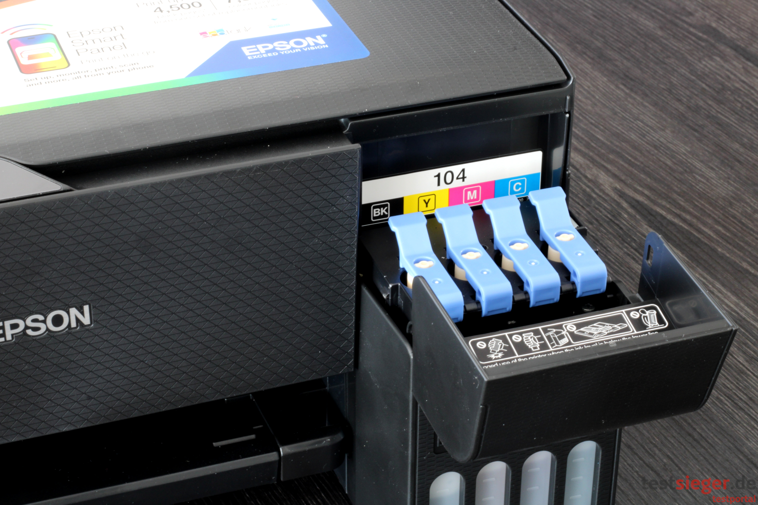 Die EcoTank-Tintentanks sind das große Verkaufsargument der Serie. Wie bereits erwähnt, benötigt der Multifunktionsdrucker keine herkömmlichen Tintenpatronen mehr. Stattdessen besitzt er vier Behälter für die Farben Cyan, Magenta, Yellow und Black, die sich über eine Klappe einfach erreichen lassen. Das Befüllen funktioniert wunderbar einfach. Nutzerinnen und Nutzer öffnen die Deckel der beiliegenden Flaschen und stecken sie auf den entsprechenden Tank auf. Danach fließt die Tinte automatisch bis zum maximalen Füllstand. Dank der Bauform ist es nicht möglich, dass die falsche Farbe in die Behälter fließt. Beim Abnehmen kann es minimal nachtropfen. Wir haben im Test damit aber keine Probleme. Wer auf Nummer sicher gehen möchte, hält direkt ein Tuch bereit. Die Tanks verfügen jeweils über ein Sichtfenster, durch die der Füllstand jederzeit sichtbar ist – ein weiterer Vorteil im Vergleich zu gängigen Patronen.