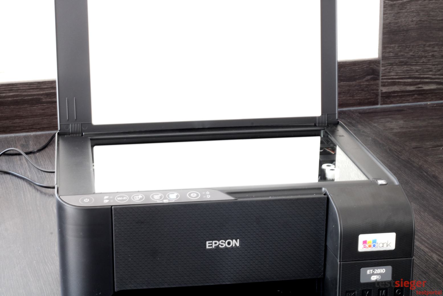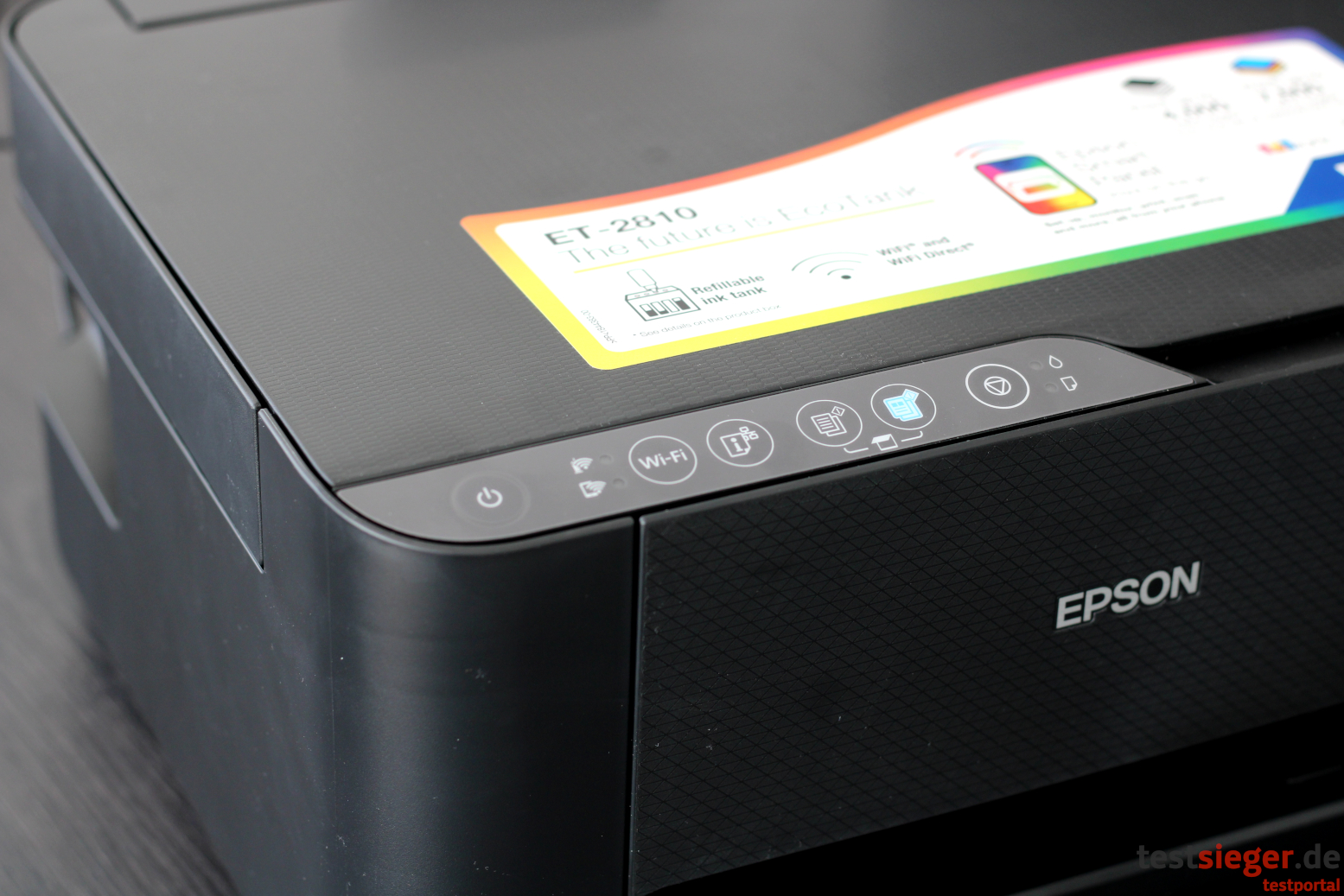Der ET-2810 bietet alle Ausstattungsmerkmale, die wir uns in dieser Preisklasse (UVP 249,99 Euro) erwarten. Er druckt mit einer hohen Maximalauflösung von 5.760 x 1.440 dpi, scannt mit maximal 1.200 x 2.400 dpi und kopiert. Wie bereits erwähnt, muss der Epson ohne Display auskommen. Die Bedienung am Gerät erfolgt ausschließlich über die insgesamt 6 Tasten auf der Oberseite vor der Dokumentenabdeckung. Die Knöpfe haben einen guten Druckpunkt und reagieren zuverlässig. Allerdings ist die Bedienung nicht selbsterklärend. Viele Tasten sind doppelt belegt, wer wirklich alle Funktionen verwenden möchte, kommt um ein ausführliches Studium der Anleitung nicht herum. Dementsprechend hätten wir uns gewünscht, dass diese in gedruckter Form beiliegt. Die Grundfunktionen wie Farb- oder Schwarzweiß-Kopien sind aber auch so schnell ersichtlich.