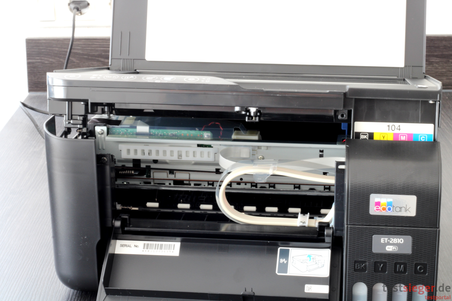 Die EcoTank-Tintentanks sind das große Verkaufsargument der Serie. Wie bereits erwähnt, benötigt der Multifunktionsdrucker keine herkömmlichen Tintenpatronen mehr. Stattdessen besitzt er vier Behälter für die Farben Cyan, Magenta, Yellow und Black, die sich über eine Klappe einfach erreichen lassen. Das Befüllen funktioniert wunderbar einfach. Nutzerinnen und Nutzer öffnen die Deckel der beiliegenden Flaschen und stecken sie auf den entsprechenden Tank auf. Danach fließt die Tinte automatisch bis zum maximalen Füllstand. Dank der Bauform ist es nicht möglich, dass die falsche Farbe in die Behälter fließt. Beim Abnehmen kann es minimal nachtropfen. Wir haben im Test damit aber keine Probleme. Wer auf Nummer sicher gehen möchte, hält direkt ein Tuch bereit. Die Tanks verfügen jeweils über ein Sichtfenster, durch die der Füllstand jederzeit sichtbar ist – ein weiterer Vorteil im Vergleich zu gängigen Patronen.
