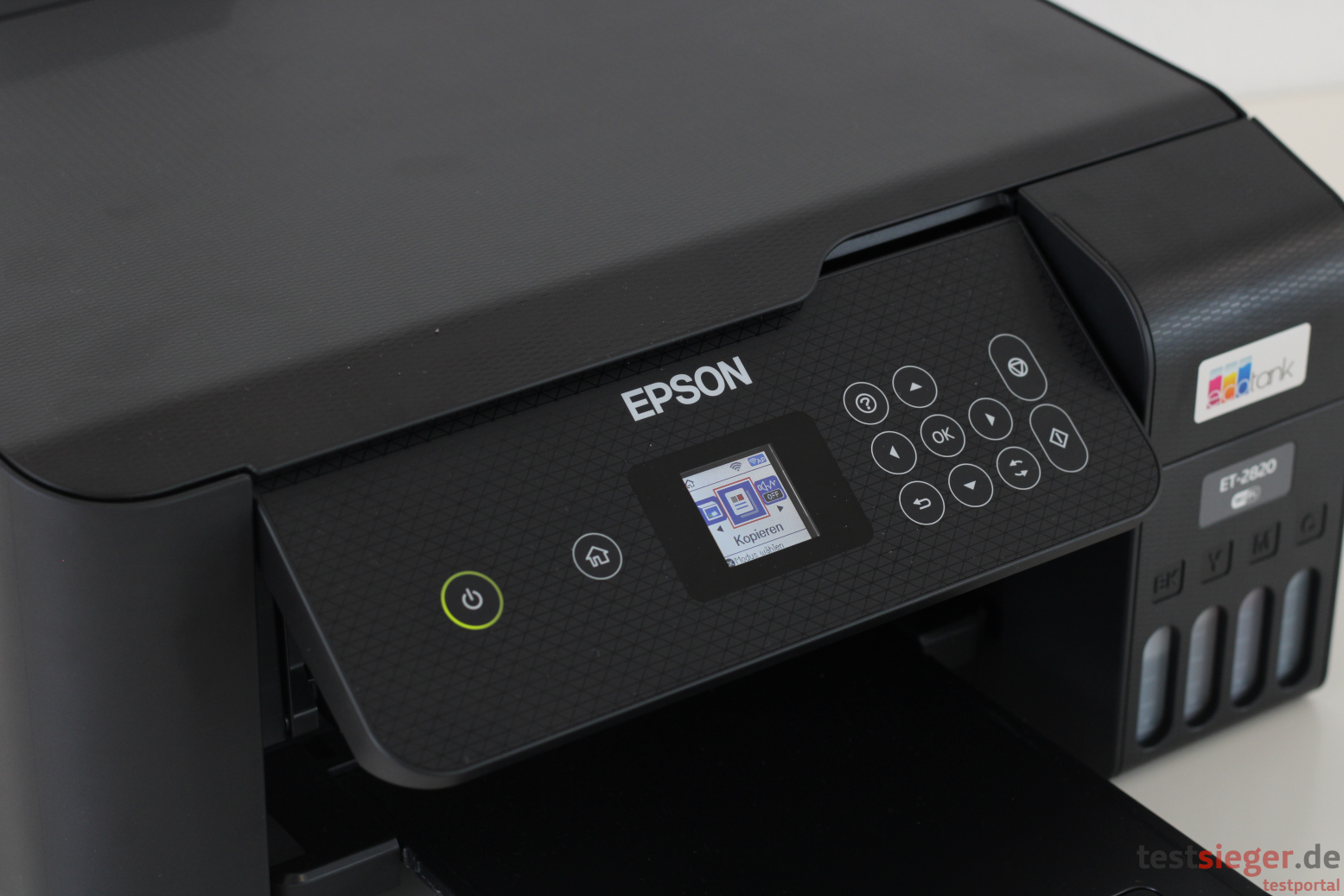 Am Gerät bedienen wir den Epson EcoTank ET-2820 über physische Tasten. Unsere Befehle werden auf dem kleinen LC-Display dargestellt. Die Auswahl der Knöpfe ist logisch. Über die vier Pfeiltasten navigieren wir durch die übersichtlichen Menüs und bestätigen über den OK-Button. Zudem sehen wir immer auf den Bildschirm, welchen Knopf wir in welchem Kontext drücken müssen. Wie bereits erwähnt, ist das Display jedoch recht klein geraten. Dagegen sehr schön: Nutzerinnen und Nutzer können das Bedienpanel für eine bessere Übersichtlichkeit stufenlos um bis zu 90 Grad nach oben klappen.