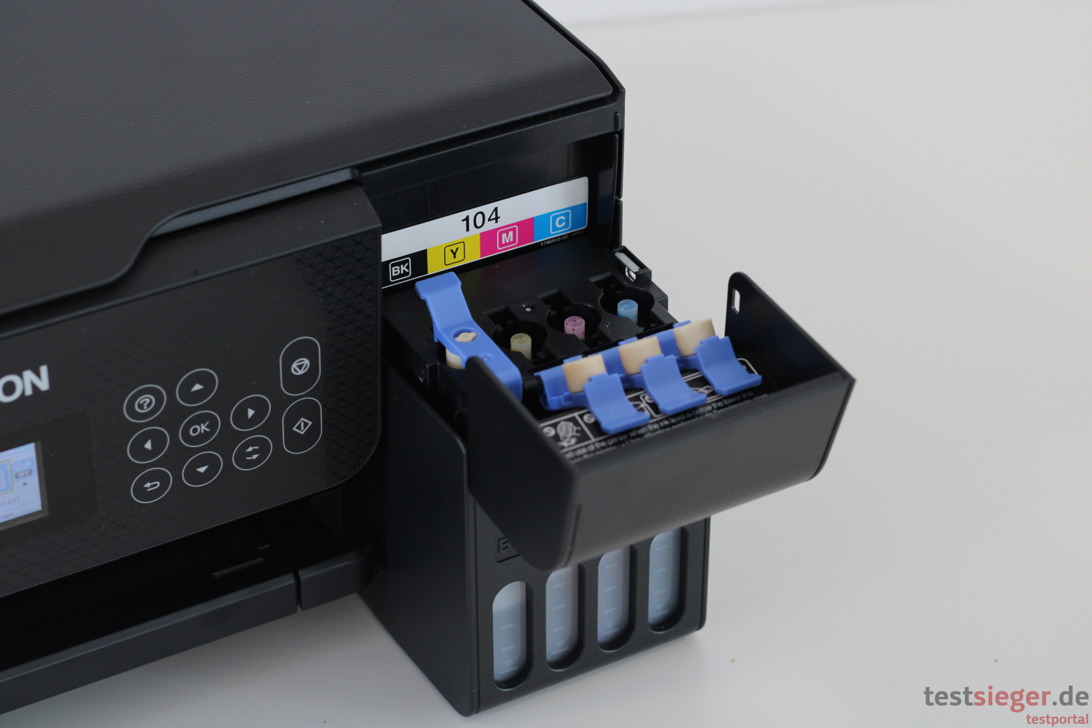 Das EcoTank-System ersetzt die herkömmlichen Tintenpatronen. Im Lieferumfang befinden sich Tintenflaschen für die Farben Cyan, Magenta, Yellow und Black. Nutzerinnen und Nutzer setzen diese einfach auf die Öffnung der Tanks und sehen zu, wie die Tinte danach automatisch in die Tanks läuft. Der Vorgang stoppt, sobald der maximale Füllstand erreicht ist, auch wenn sich noch Tinte in den Flaschen befindet. Das Befüllen bereitet uns in der Praxis keine Probleme, nach wenigen Minuten sind die Tanks voll. Nutzerinnen und Nutzer müssen dabei keine Angst haben, versehentlich die falschen Tanks zu befüllen. Aufgrund der speziellen Bauform passen die jeweiligen Flaschen auch nur auf den richten Tintenbehälter. Beim Abnehmen kann es vorkommen, dass etwas Tinte heraustropft. Wer die Flaschen jedoch schnell wieder umdreht, sollte keine Probleme haben. Über Fenster in den Tanks haben wir den aktuellen Tintenfüllstand jederzeit gut im Blick, er wird aber auch in der Epson-Smart-Panel-App dargestellt.