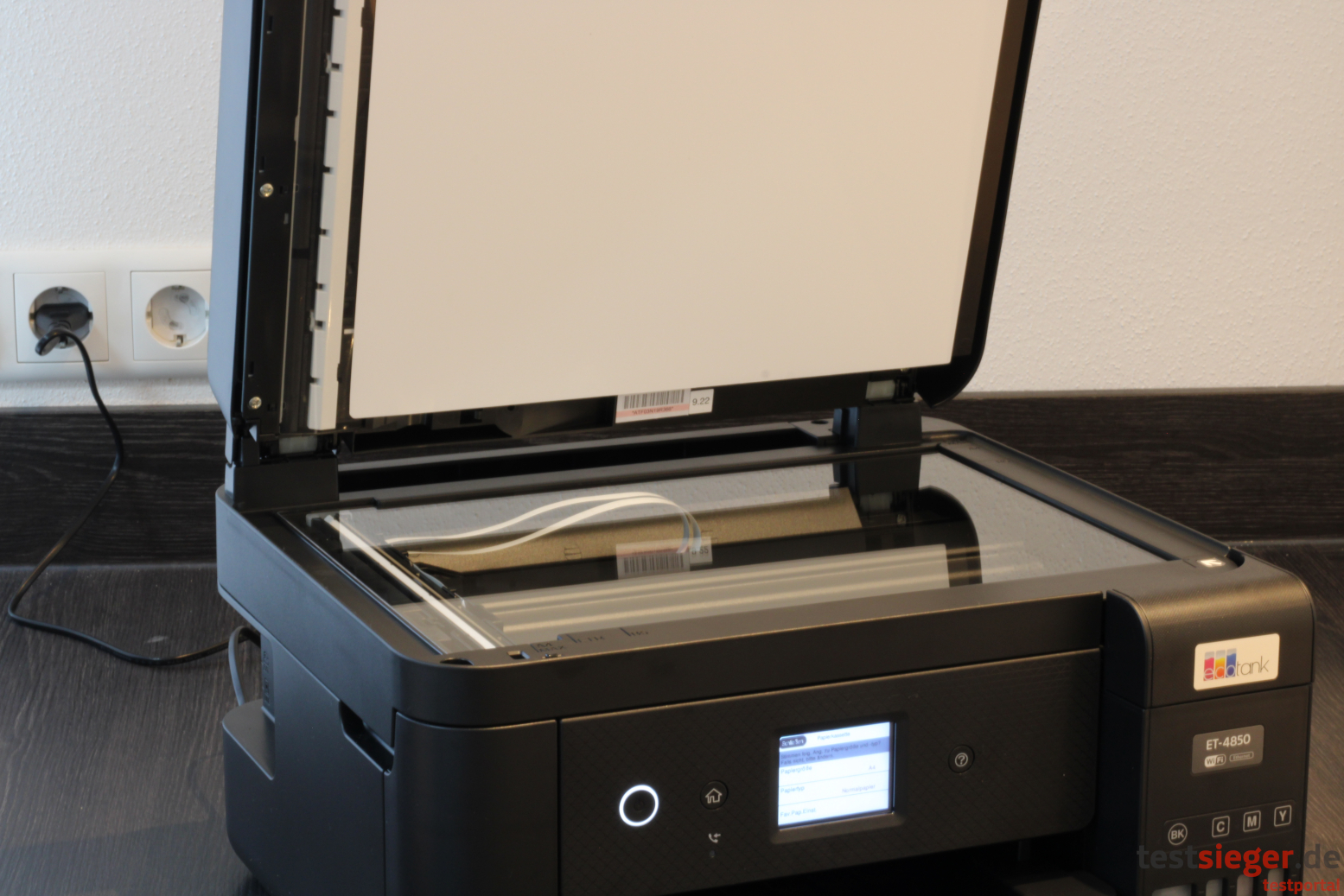 Der Epson ET-4850 bietet einen großen Umfang. So ist beispielsweise eine Fax-Funktion enthalten und Duplex-Druck möglich. Das Multifunktionsgerät druckt mit einer Maximalauflösung von 4.800 x 1.200 dpi, scannt mit maximal 1.200 x 2.400 dpi und kopiert. Die Bedienung über den Touchscreen funktioniert grundsätzlich gut, allerdings macht es die kleine Displaydiagonale teilweise etwas schwer, die einzelnen Buttons zu treffen – vor allem in den Kanten. Der Bildschirm setzt die meisten Eingaben sicher in die Tat um, wenn auch etwas träge. Nur vereinzelt müssen wir die Befehle wiederholen. Die Menüstruktur ist jedoch logisch aufgebaut und alle Funktionen und Einstellungen schnell gefunden. Neben dem Touchscreen verfügt der Epson noch über drei physische Tasten: Power, Home und Hilfe. Das Bedienpanel lässt sich stufenlos um fast 90 Grad nach oben klappen – sehr hilfreich, wenn sich der Multifunktionsdrucker nicht auf Augenhöhe befindet.