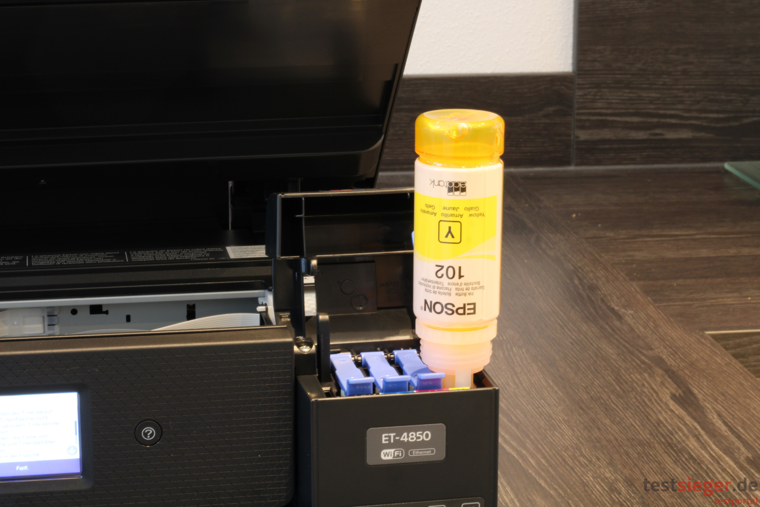 Das Befüllen klappt sehr einfach. Allerdings lässt sich der Deckel zu den Behältern nur öffnen, wenn die Wartungsklappe samt Scan-Einheit nach oben geklappt ist. Da diese jedoch fest einrastet und nicht gehalten werden muss, ist das kein Problem. Zunächst die Klappen der Tanks öffnen und die Flaschen auf die entsprechende Öffnung aufsetzen. Danach fließt die Tinte automatisch, bis der maximale Füllstand erreicht ist. Sinnvoll: Aufgrund der Bauform passen die Flaschen auch nur auf den dafür vorgesehenen Tintenbehälter. Beim Aufsetzen und Abnehmen kann etwas Tinte heraustropfen, wenn man sich jedoch nicht zu viel Zeit lässt, sollte es auch so klappen. Es schadet jedoch nicht, sicherheitshalber ein Tuch bereitzulegen. Dank kleiner Fenster auf der Vorderseite ist der Füllstand jederzeit erkennbar – ein weiterer Vorteil im Gegensatz zu herkömmlichen Varianten.