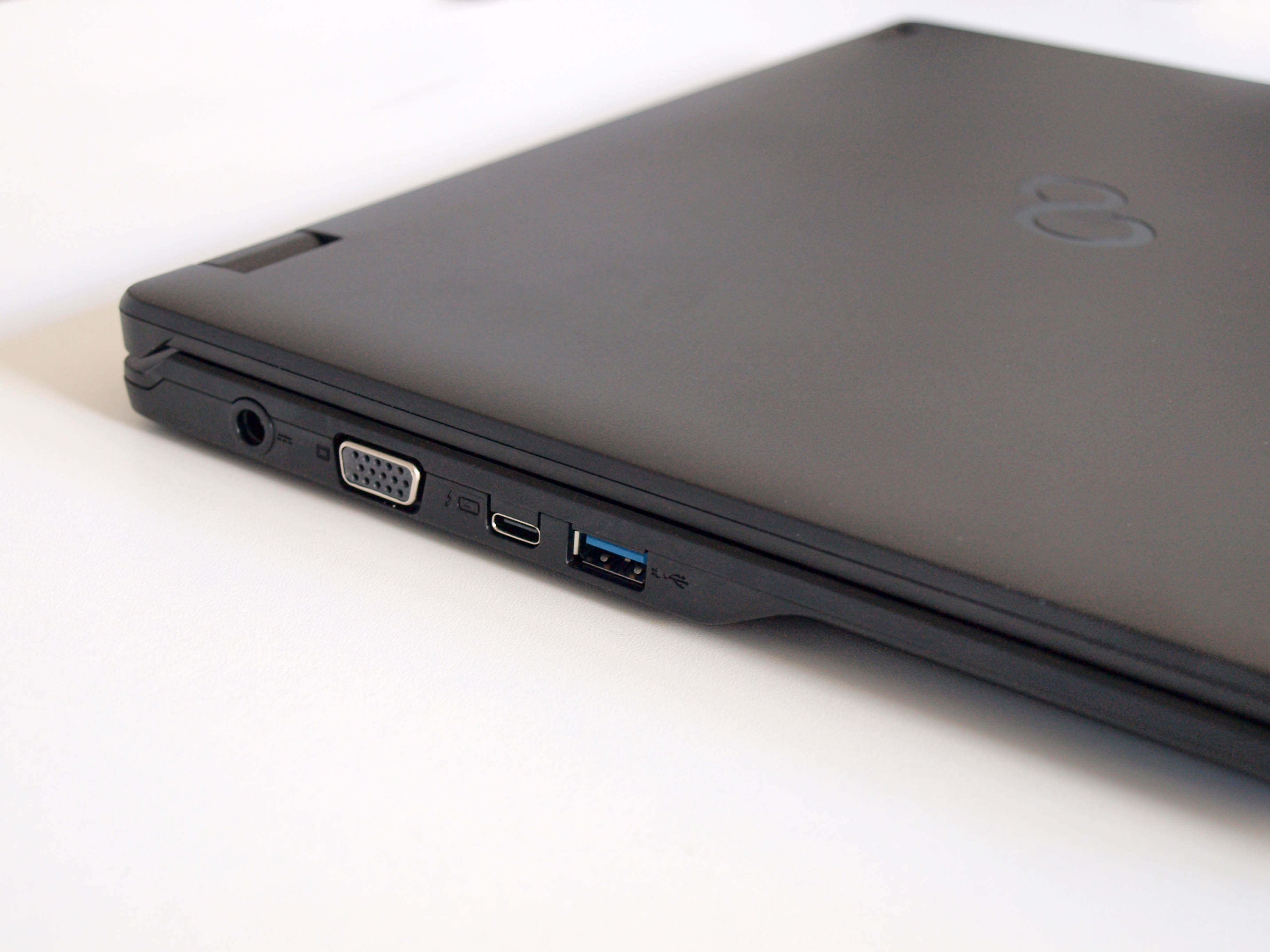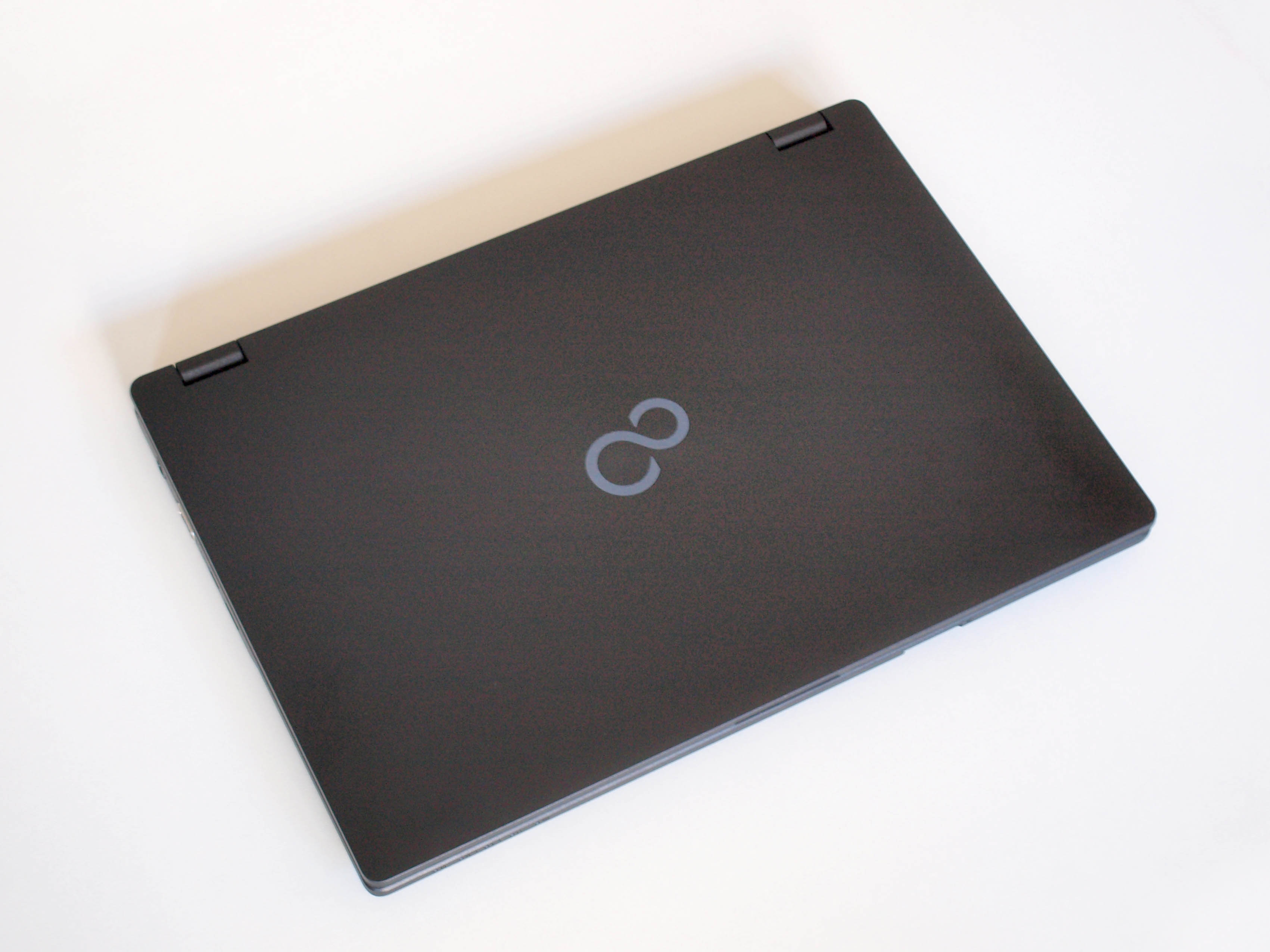 Das Gerät zeigt keinerlei Produktionsrückstände und weist keine auffälligen Spaltmaße auf. Lediglich über den Scharnieren befindet sich jeweils ein etwas größerer Spalt. Die Scharniere sind sehr fest, halten den Bildschirm gut in Position und machen dabei keinerlei Geräusche beim Öffnen und Schließen. Dadurch lässt sich der Laptop allerdings nicht mit einer Hand öffnen. Das kompakte Gerät ist 33,4 Zentimeter breit, 23,4 Zentimeter tief und 2,4 Zentimeter hoch und findet bequem Platz in jedem gängigen Rucksack. Im 90 Grad Winkel aufgeklappt weist der Bildschirm eine Höhe von 24,7 Zentimetern auf. Und mit 1,79 Kilogramm Gewicht ist das Fujitsu LIFEBOOK einfach zu transportieren.