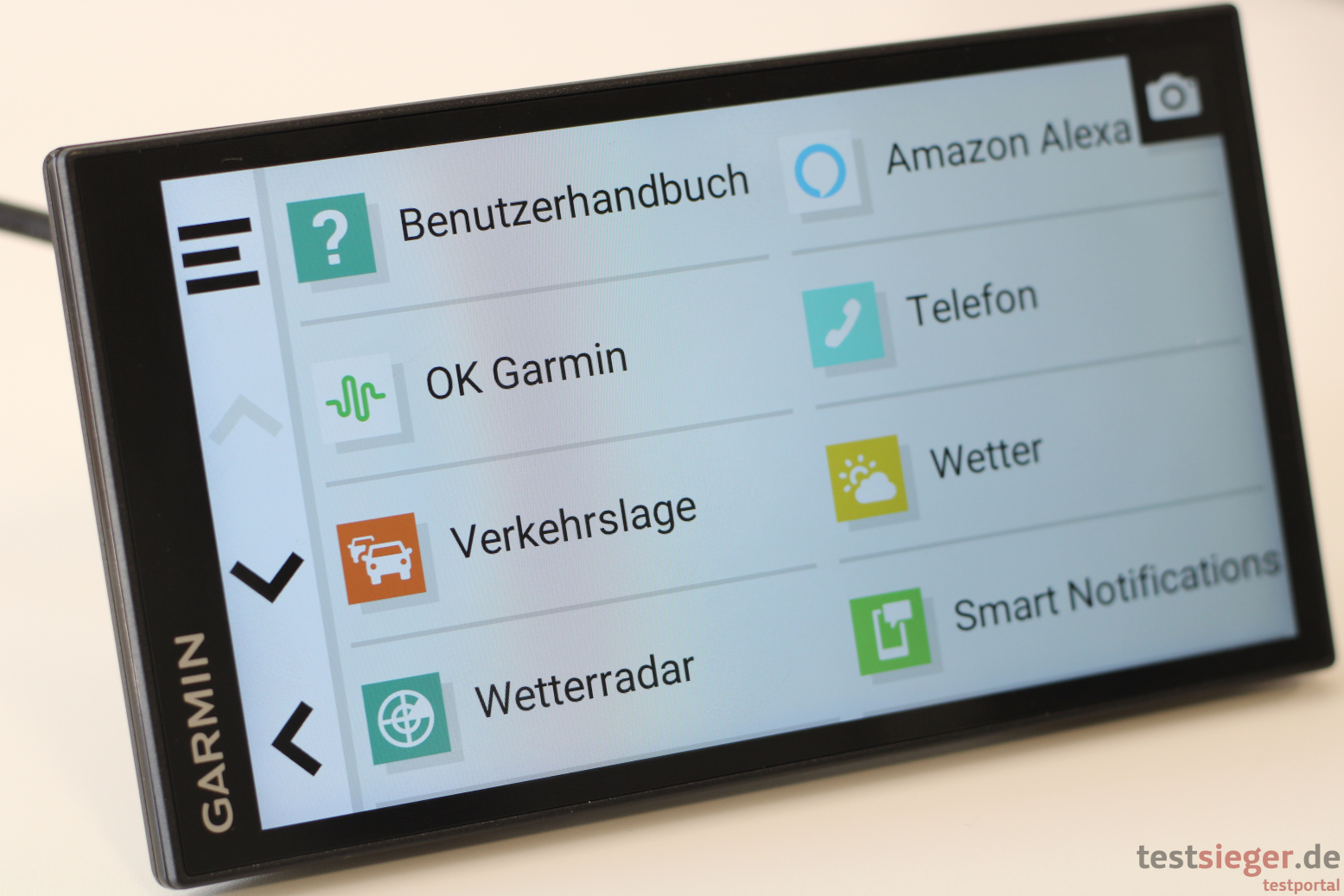 Die Bedienung erfolgt zu einem Großteil über den Touchscreen. Eine physische Taste auf der Rückseite und ist für das Ein- und Ausschalten des Navis zuständig. Der Knopf ist gut zu erreichen und auch während der Fahrt lässt er sich leicht erfühlen. Die zweite Taste befindet sich auf der Oberseite und aktiviert auf Wunsch die Amazon-Alexa-Unterstützung. Wie bereits erwähnt, funktioniert die Bedienung über den Touchscreen angenehm einfach. Die Buttons sind selbst auf der kleineren 6-Zoll-Variante angenehm groß und lassen sich auch während der Fahrt gut treffen, obwohl hier natürlich große Vorsicht geboten ist, um den Verkehr nicht aus den Augen zu verlieren.