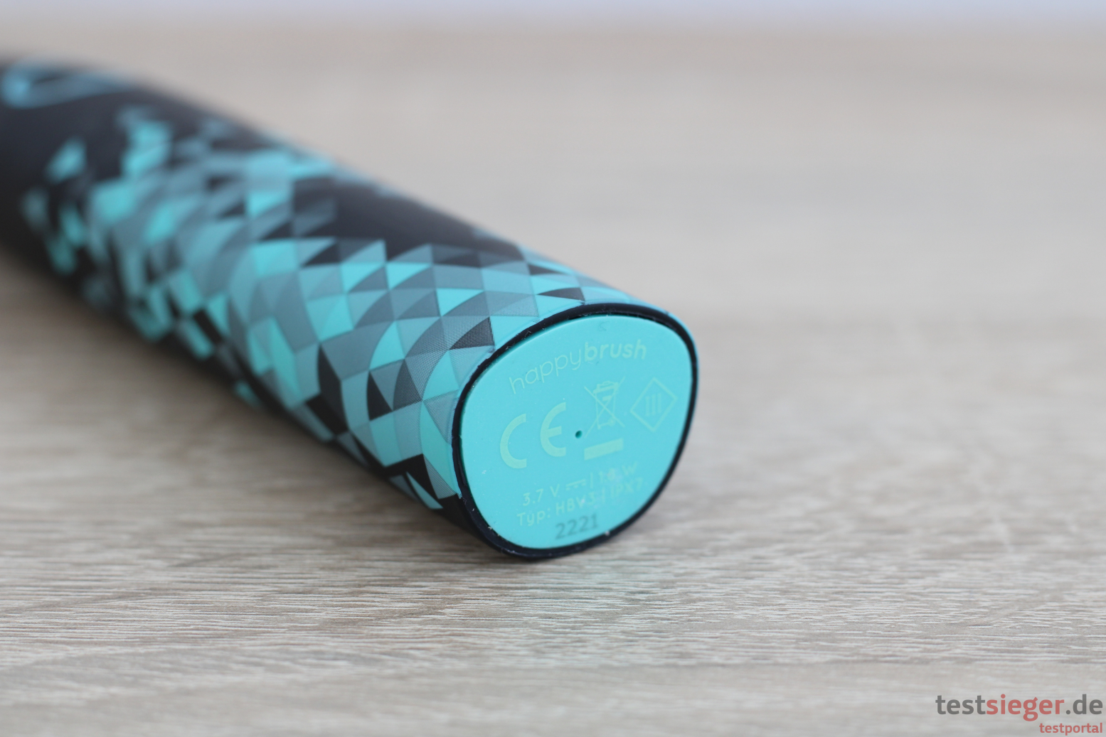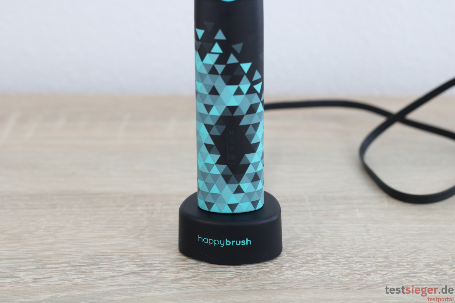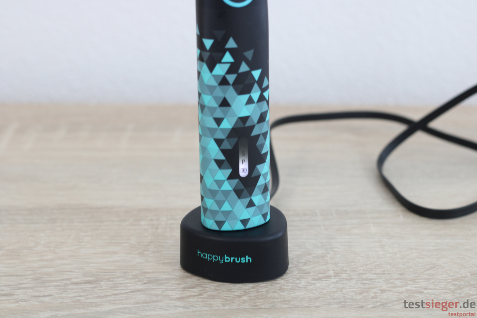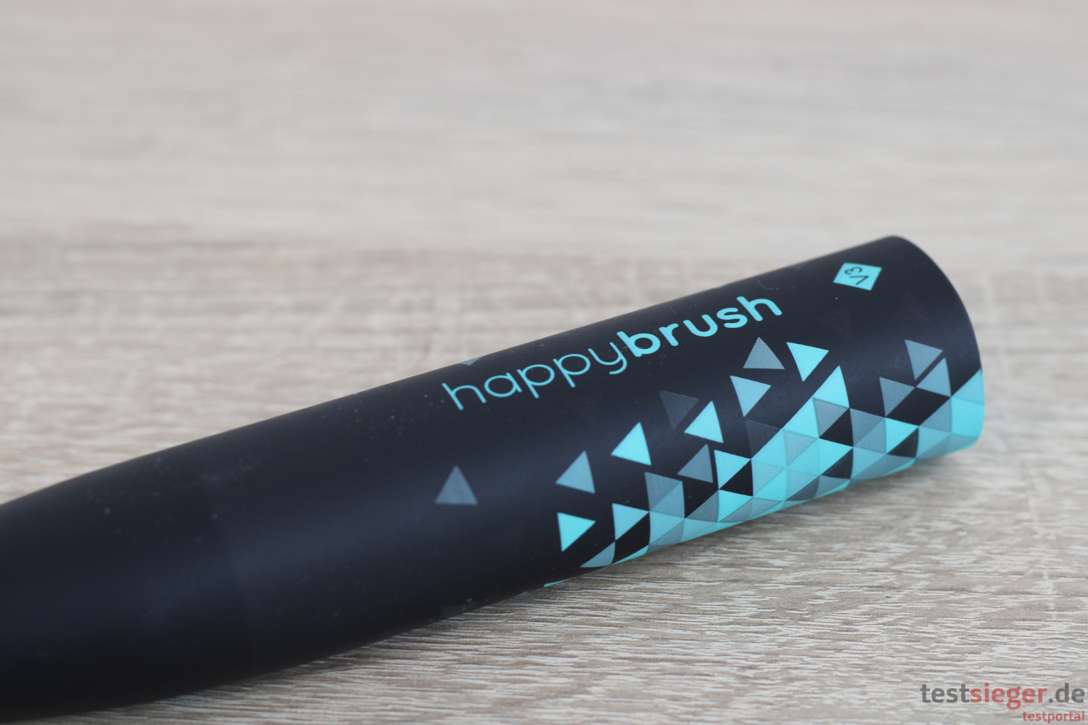Dank des schmalen Bürstenkopfes müssen Nutzerinnen und Nutzer den Mund nicht allzu weit öffnen. Wie die meisten anderen elektrischen Zahnbürsten auch, verfügt die happybrush über eine Quadranten-Funktion. Alle 30 Sekunden stoppt der Bürstenkopf kurz und signalisiert, dass es Zeit für den nächsten Mundabschnitt ist. Dank IPX7-Zertifizierung lässt sie sich problemlos unter der Dusche verwenden. Die Oberfläche ist recht griffig, was zu einer angenehmen Handhabung führt. Hier hilft auch das niedrige Gewicht knapp über 100 Gramm.