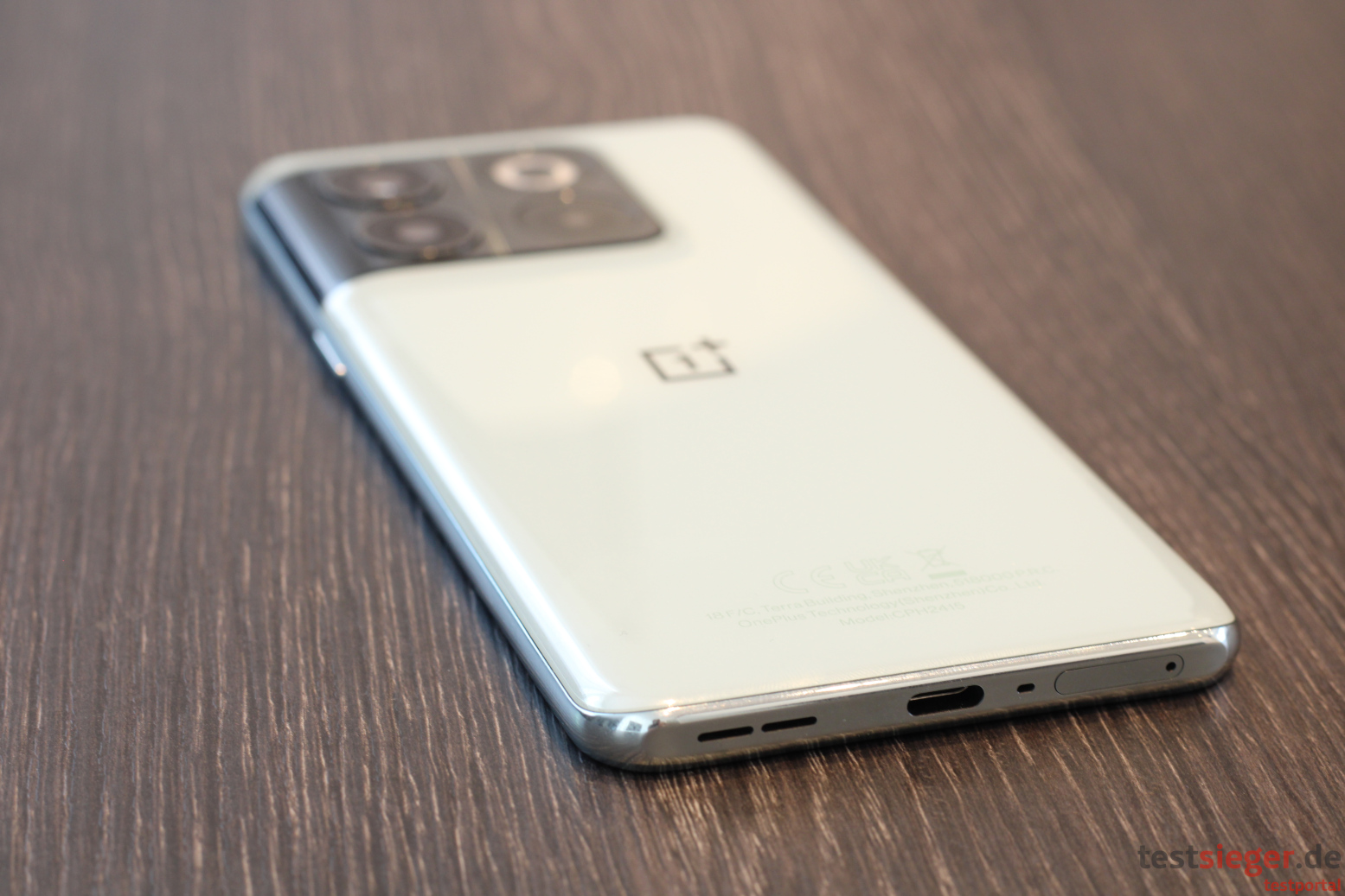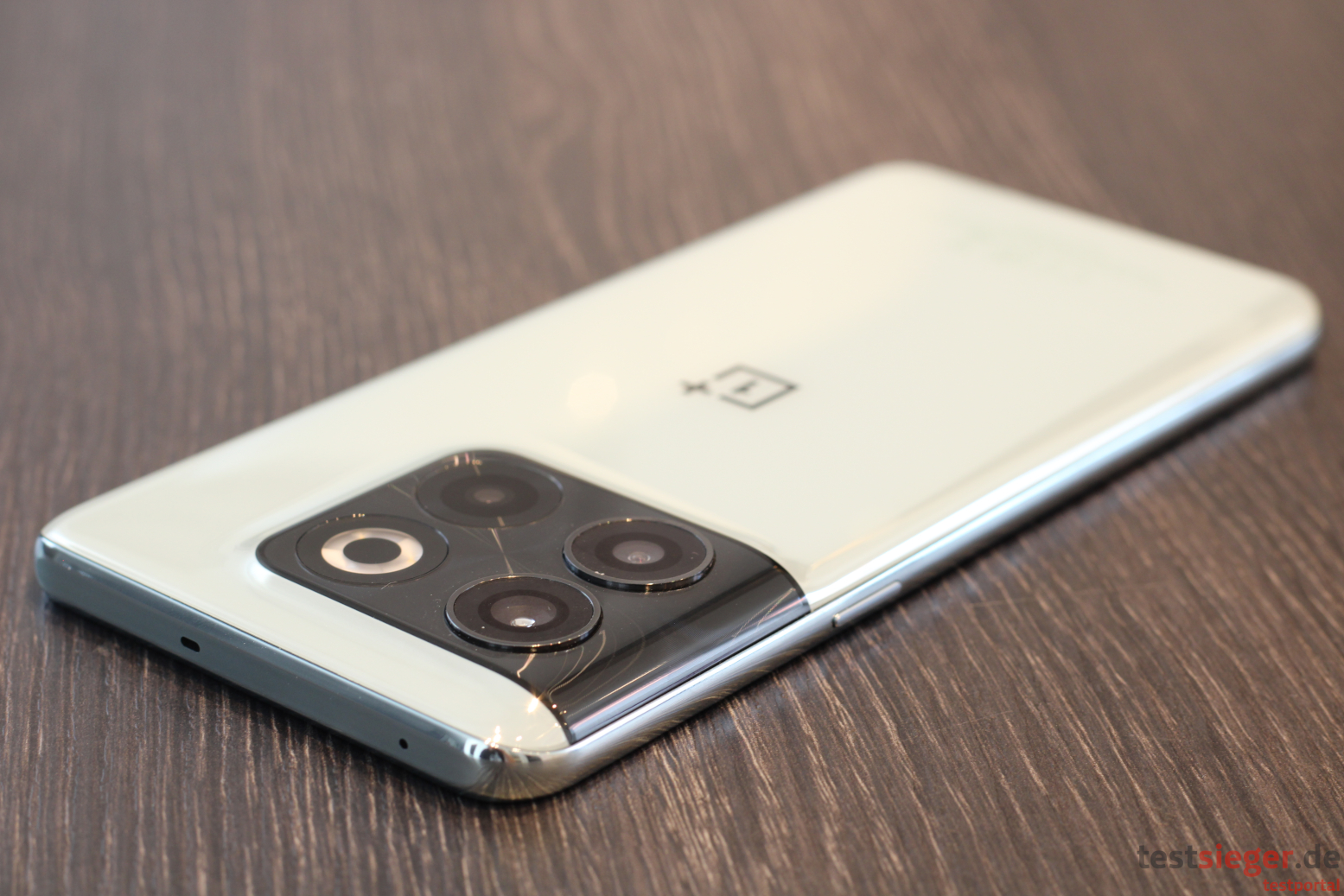 Beim Design orientiert sich OnePlus stark beim 10 Pro. Die große Kamera-Einheit auf der Rückseite ist prominent und sticht deutlich hervor. Im Vergleich zum Flaggschiff-Modell ist das restliche Gehäuse deutlich zum Kamera-Modul hin angehoben, wodurch es nicht mehr so kantig hervorsteht. Das ist sicherlich Geschmackssache, uns persönlich gefällt die kantige Variante jedoch etwas besser. Ebenfalls ein kleiner Nachteil zum 10 Pro: Die Kameraeinheit zieht sich zwar ebenfalls noch über den seitlichen Rand hinweg, geht jedoch nicht mehr in den Rahmen über.