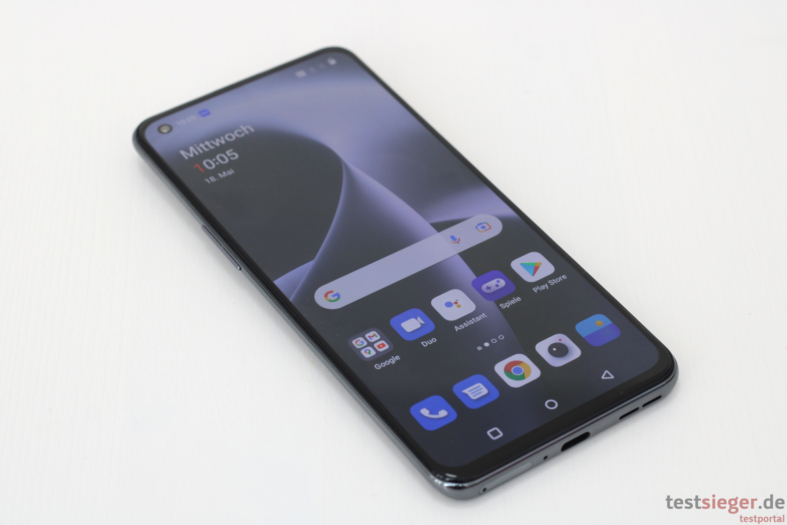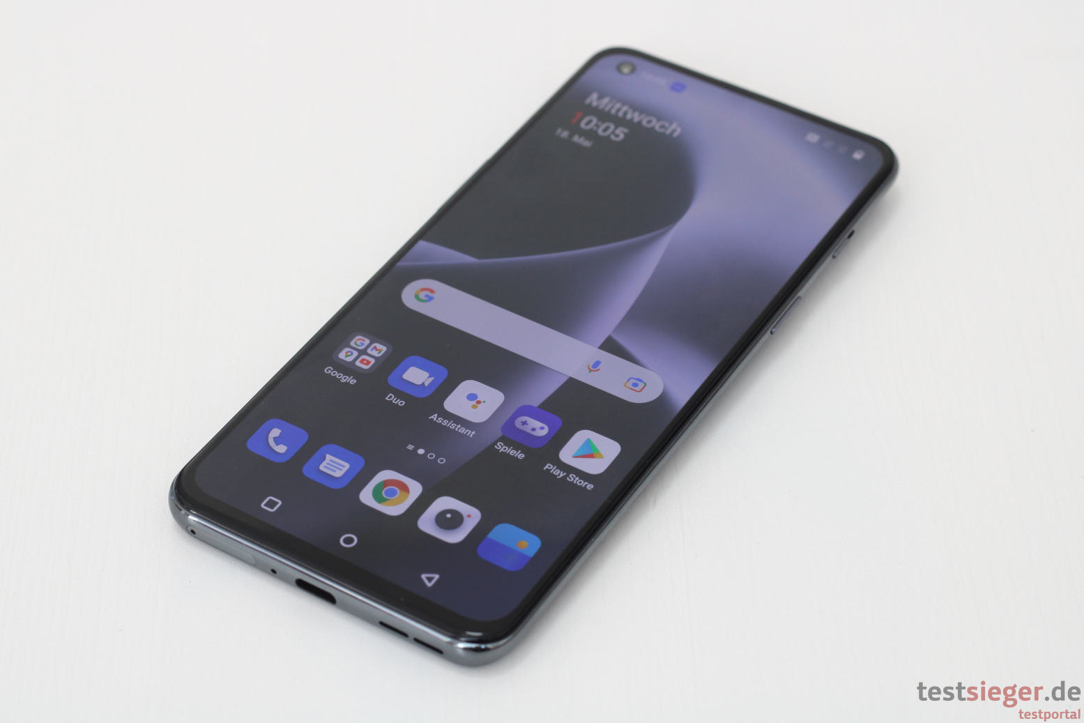Beim Display ändert OnePlus im Vergleich zum Vorgänger nichts. Das Nord 2T verfügt über ein AMOLED-Display mit einer Diagonale von 6,43 Zoll bei einem Seitenverhältnis von 20:9. In Kombination mit der FullHD+-Auflösung von 2.400 x 1.080 Pixeln ergibt sich eine sehr gute Pixeldichte von 409 ppi. Das führt zu einer kristallklaren Darstellung. Wir können selbst bei nahem Blick keine Pixel mehr erkennen. Wer möchte, kann das Alway-On-Display aktivieren, welches sich beim Anheben des Smartphones aktiviert. Dieses zieht aber natürlich etwas am Akku. Die Maximalhelligkeit ist ordentlich, auch wenn das OnePlus Nord 2T 5G nicht zu den hellsten Smartphones am Markt gehört. Wir haben keine Probleme, die Inhalte auch bei direkter Sonneneinstrahlung zu erkennen. Die Ausleuchtung ist gleichmäßig, wir entdecken keine Lichthöfe an den Ecken des Bildschirms.