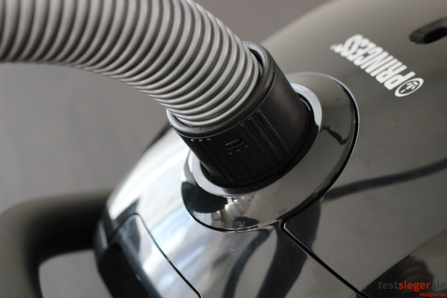 Damit ist der Princess sicherlich nicht der flexibelste Staubsauger auf dem Markt, es geht aber in Ordnung. Eine ausgezeichnete Flexibilität lässt dagegen der hohe Aktionsradius von circa 12 Metern zu, der sich unter anderem aus dem 9 Meter langen Stromkabel, dem 1,5 Meter langen Schlauch und dem Saugrohr ergibt. Letzteres lässt sich über einen Schieberegler in der Höhe verstellen: von 52 auf maximal 100 Zentimeter. Der Mechanismus funktioniert in der Praxis gut. Das Rohr rastet an bestimmten Punkten fest ein, ganz stufenlos lässt es sich also nicht verstellen.